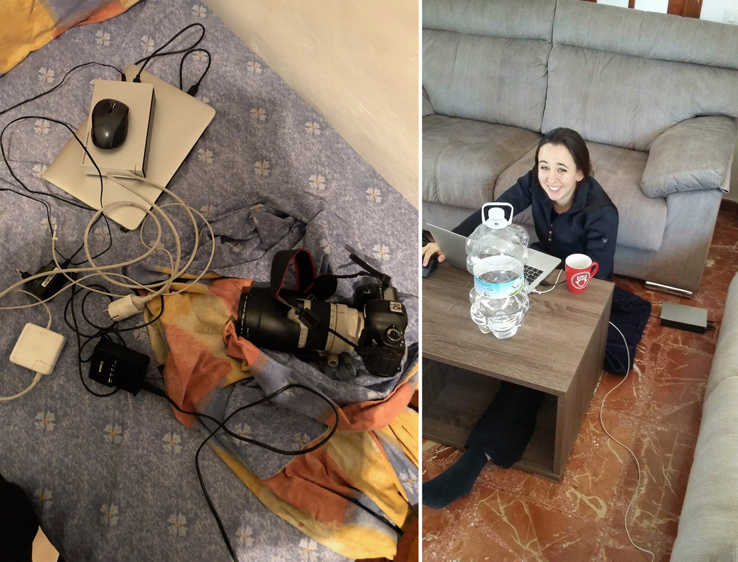 Links: Mein Kabelsalat. Rechts: Gemütliches Bearbeiten mit der kleinen Version der andalusischen Wasserflaschen.