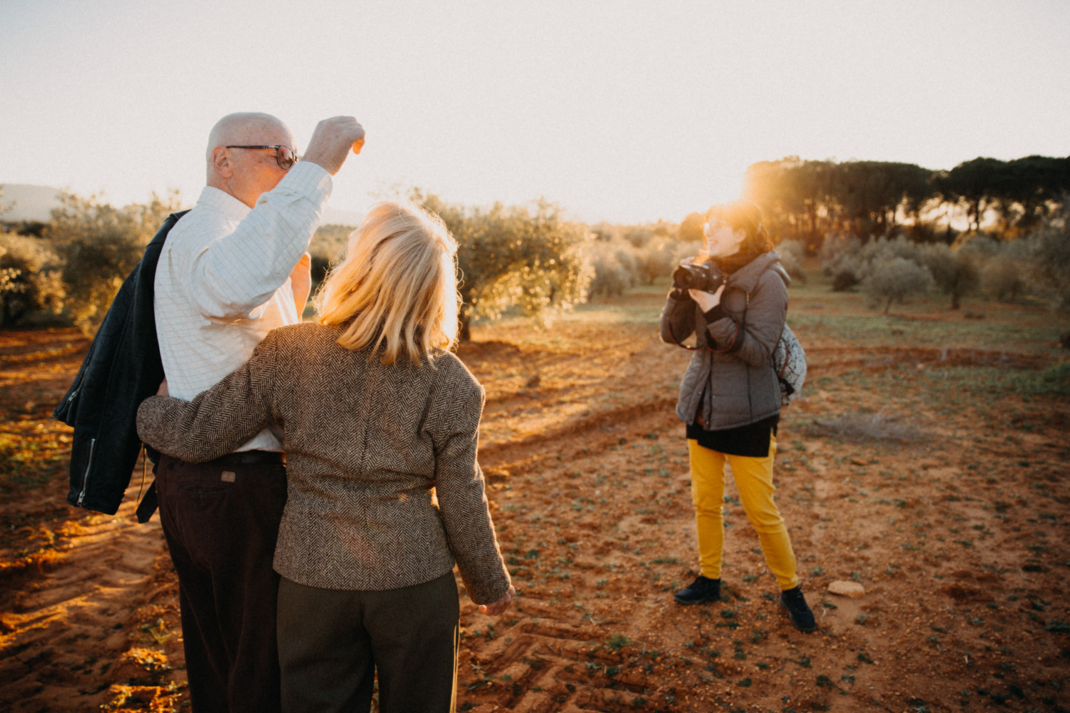 Bei einer unglaublich guten Pizza (ja, in Spanien) haben wir uns die (doch wieder) knurrenden Mägen gefüllt und machten uns danach wieder auf Richtung zu Hause. Ich war ganz wild darauf, schon die ersten Fotos zu bearbeiten, doch irgendwie war die Zeit wie im Fluge vergangen und so war es ohne ein einziges bearbeitetes Bild schon wieder Zeit für unseren nächsten Termin (ein bisschen Schweizer Kultur hab ich schon mitgebracht!): Das Shooting mit Udo & Margrit. Auch sie sind Auswanderer, zwar aus Deutschland, aber immerhin konnte diesmal auch ich mitreden! 😉 Martina & Patrick haben uns zuvor (während wir Fotografen uns von den Strapazen des Vormittags noch schnell erholt haben;)) einen wie von mir bestellten Olivenhain mit der wunderschönen roten Erde gesucht. So sind wie also zu sechst losgezogen für unser erstes Paarshooting – denn auch das wollten wir unbedingt machen. Wenn man schon mal so schöne Locations vor der Haustüre hat!! Bei ganz viel Spass und Udos lustigen Geschichten aus seinem Leben als Künstler, Schlagersänger und noch so einigem mehr haben wir bei absolut perfektem Licht dieses wunderbar spezielle Paar abgelichtet – immer dann, wenn wir Udo dazu überreden konnten, Sonnenbrille und Hut kurz abzulegen 😉 Auch diese Fotos gibt es wieder in einem separaten Post, hier ein paar Making-Of Bilder und zwei Fotos dieser atemberaubenden Landschaft. Auch wenns nicht so aussieht, da ist sehr wenig Photoshop dabei!!