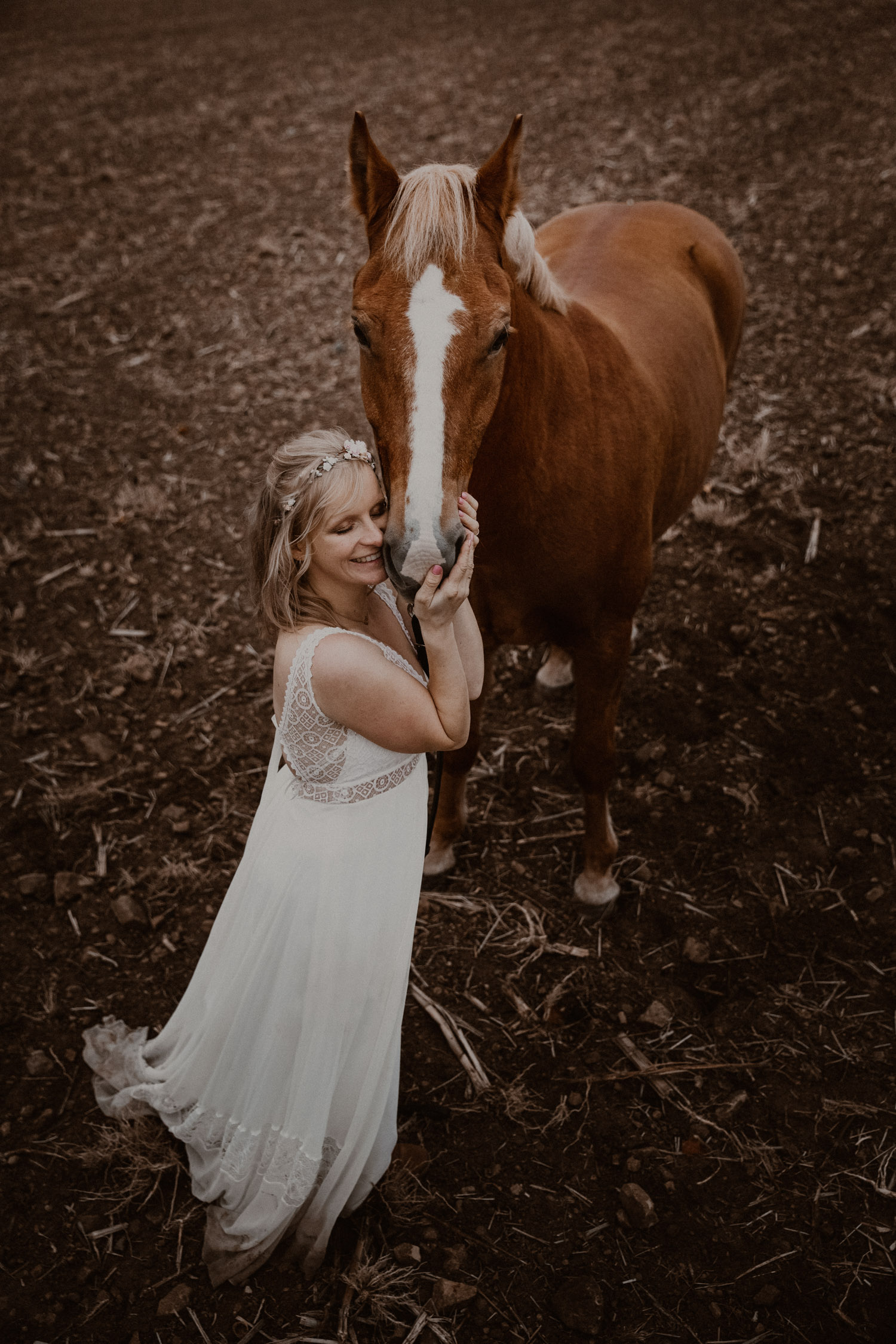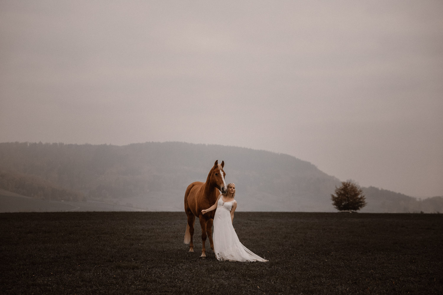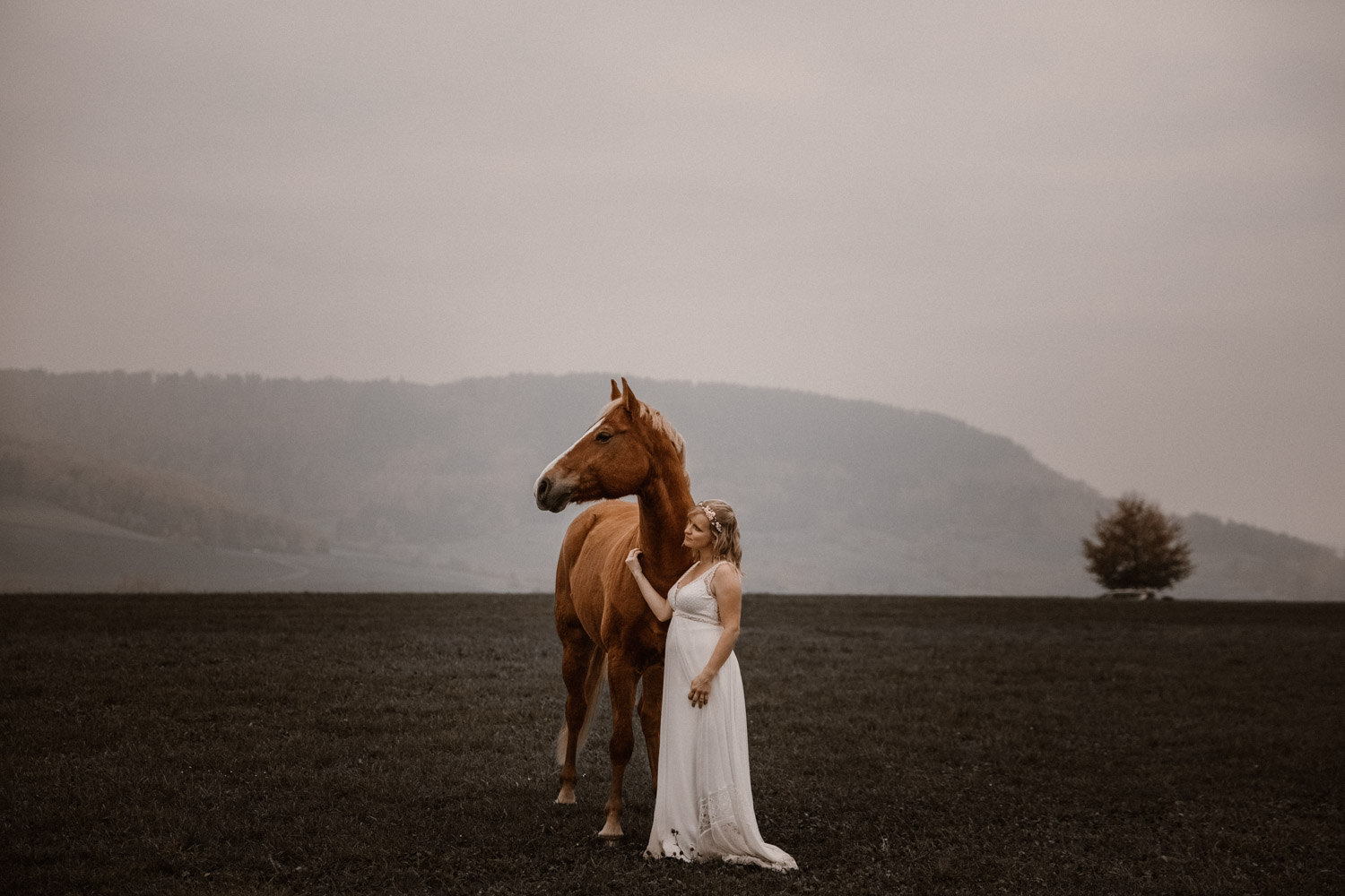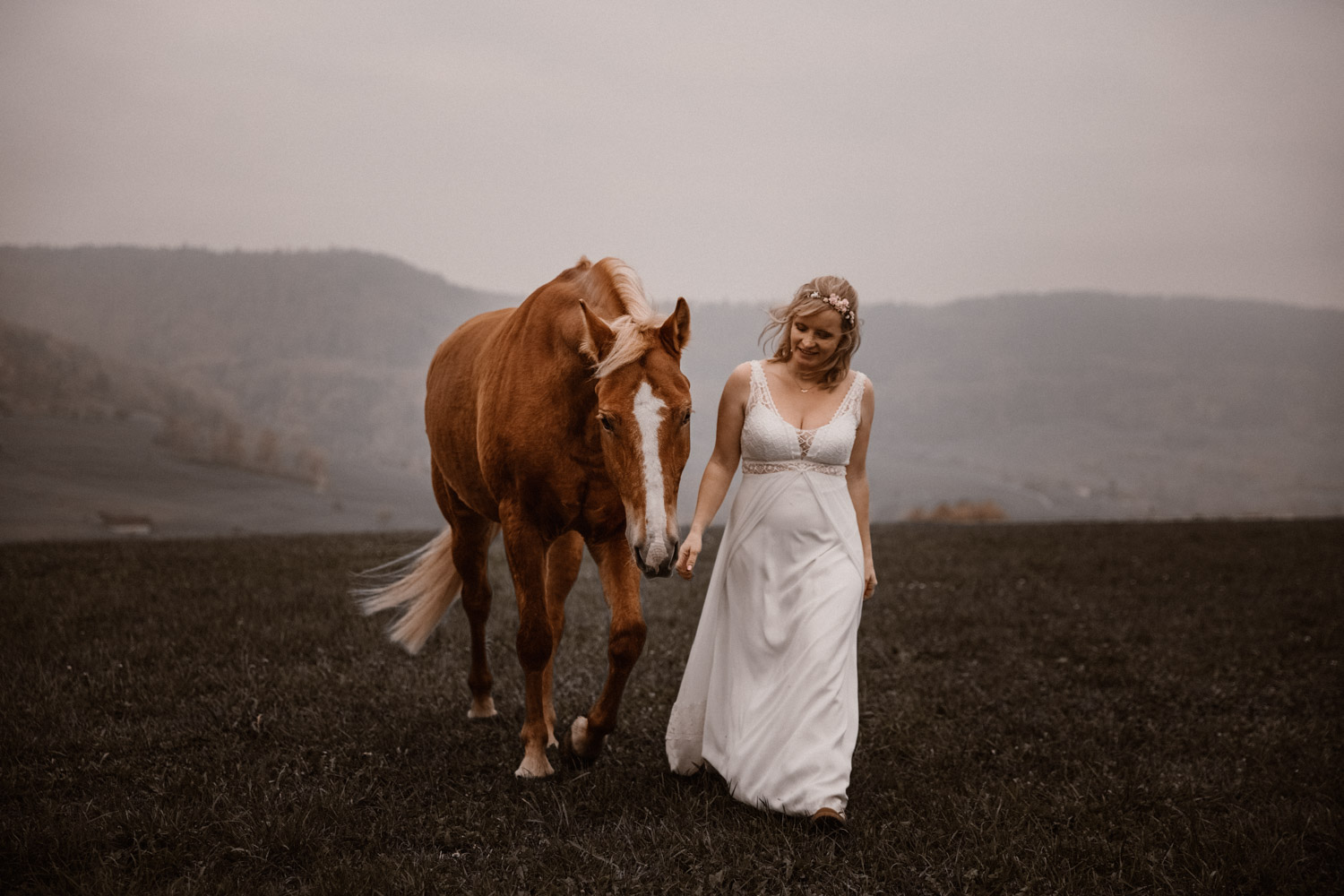 Ein Hochzeitsshooting mit Pferd, oder ein Pferdeshooting im Brautkleid… man mag es nennen wie man möchte. Viele haben mir schon erzählt, dass sie das unbedingt machen möchten, aber meistens ist es dann doch nicht zustande gekommen. Anouk aber hat Wort gehalten und so haben wir uns einige Monate nach ihrer Hochzeit getroffen, um sie – mittlerweile mit kleinem Babybauch 🙂 – zusammen mit dem frechen aber so liebeswürdigen Nils zu fotografieren. Bis kurz vor dem Shooting hatten wir noch keine konkrete Idee für eine Location, doch dann ist mir spontan etwas eingefallen, und nach einer kurzen Location-Scouting-Tour am Abend davor konnte es losgehen. Dank kurzen Fresspausen zwischendrin hat Freiberger Nils auch mit sehr viel (manchmal etwas zu viel) Motivation mitgemacht, und es sind glaube ich schöne, spezielle und unklassische Fotos einer Braut mit ihrem Pferd entstanden 🙂 Wer mich kennt, der weiss, dass man mir mit dem klassischen Braut im Prinzessinnenkleid + Pferd + Sonnenuntergang keine Begeisterung entlocken kann – zu oft gesehen, zu viel Klischee und zu wenig meinem Bild von Pferden entsprechend. Aber mit einem schlichten Kleid, etwas unglamourösem muddy look und einem durch viele gemeinsame Jahre eingeschweissten Paar bin ich voll dabei. Pferde sind keine Luxusaccessoires (ok, ein bisschen vielleicht schon 😉 ), sondern in erster Linie vierbeinige Partner, die einem durch alle Lebensphasen hindurch begleiten. Der nächste Lebensabschnitt sieht man hier schon etwas wachsen und ich wünsche dieser kleinen Familie alles Gute dafür!