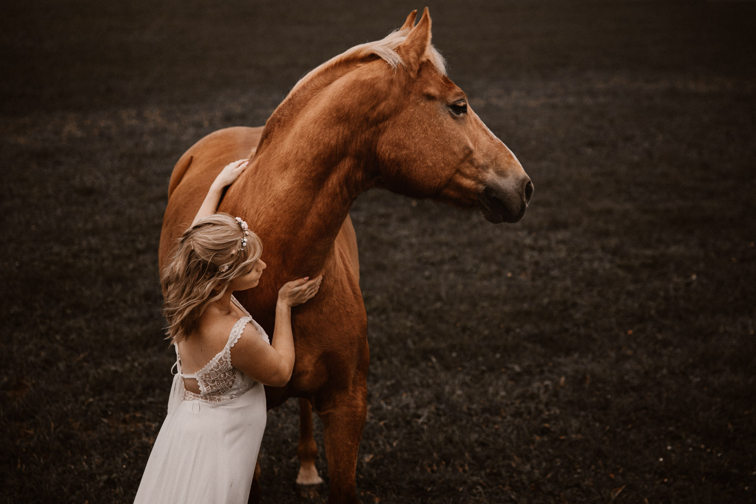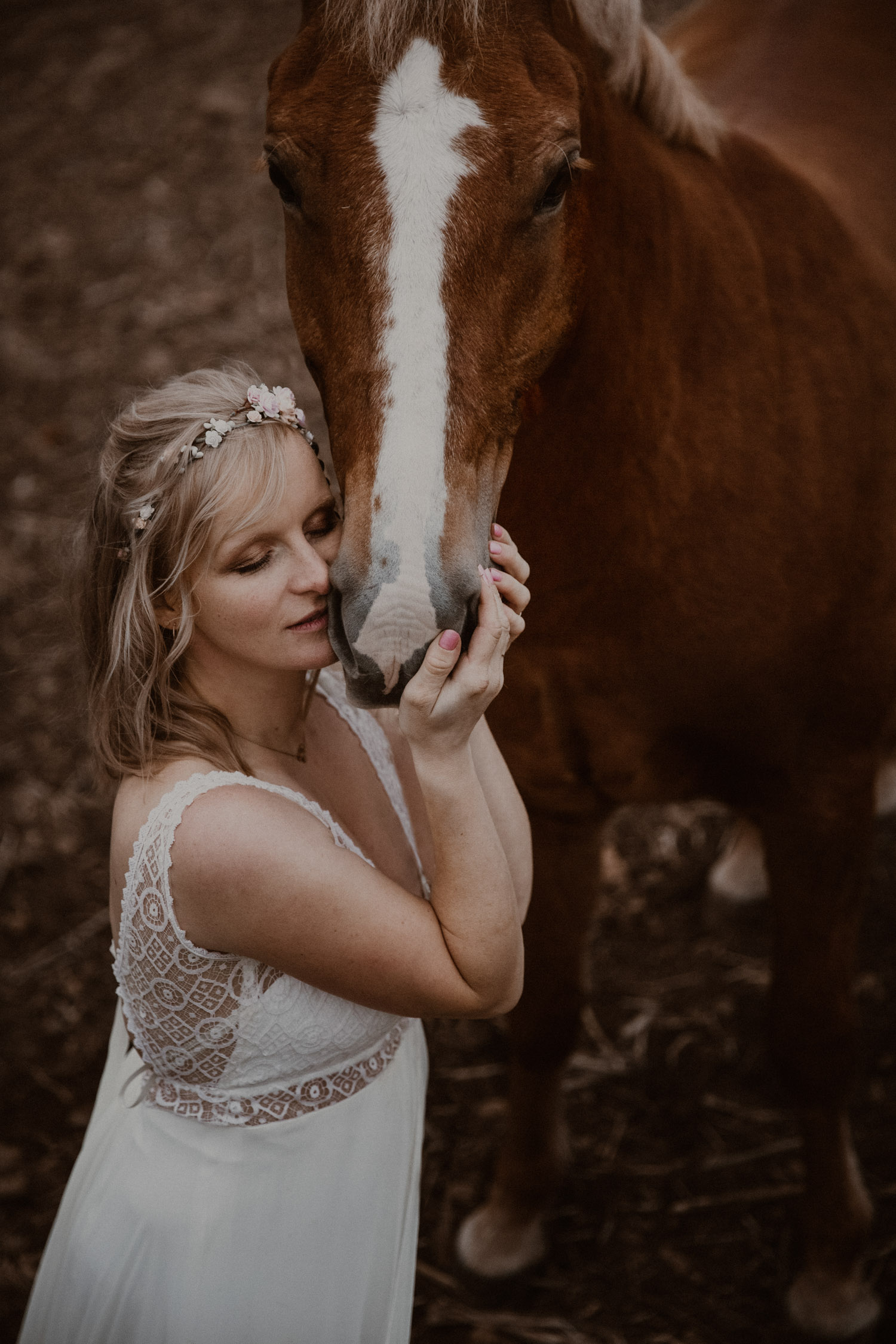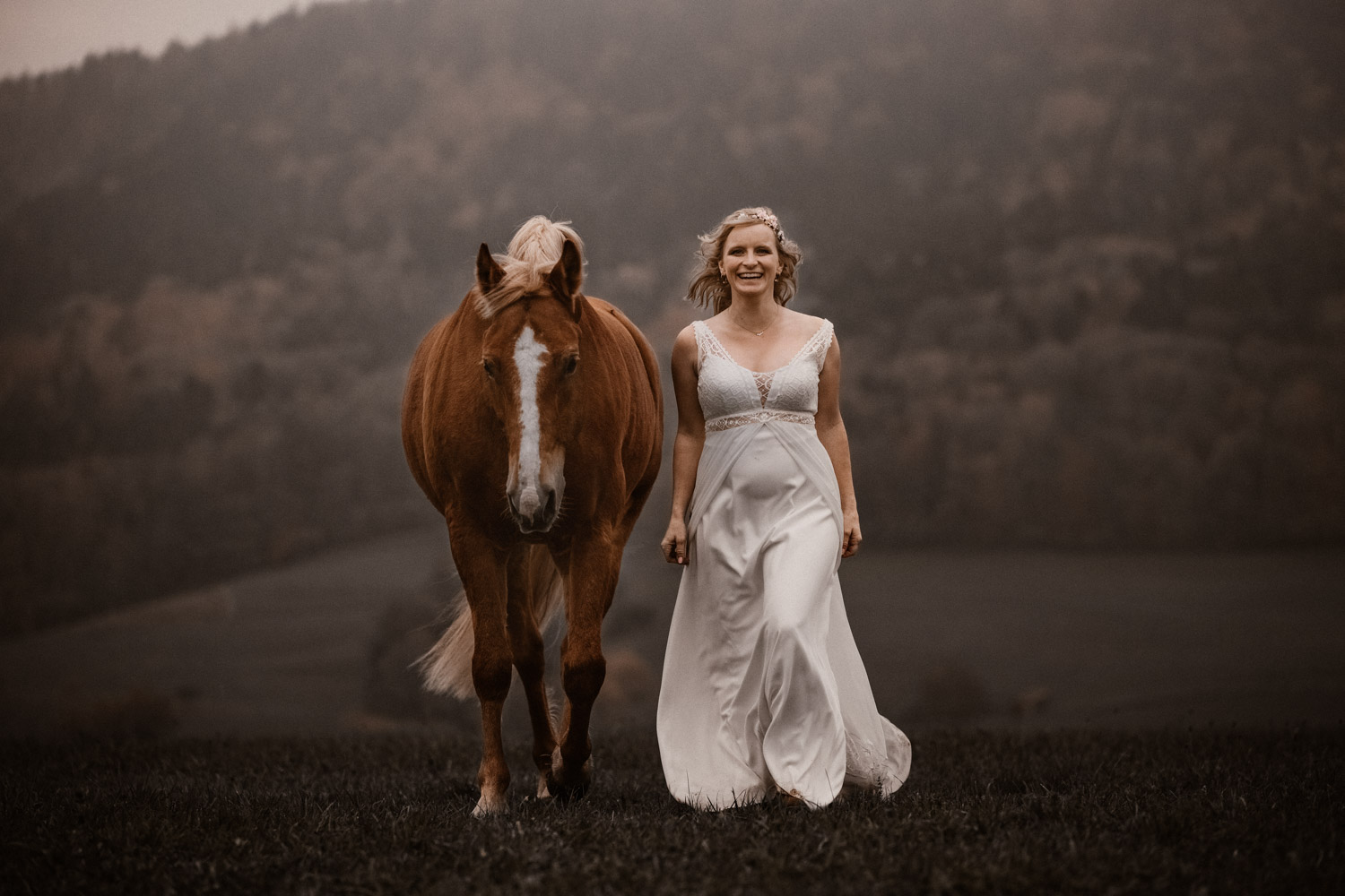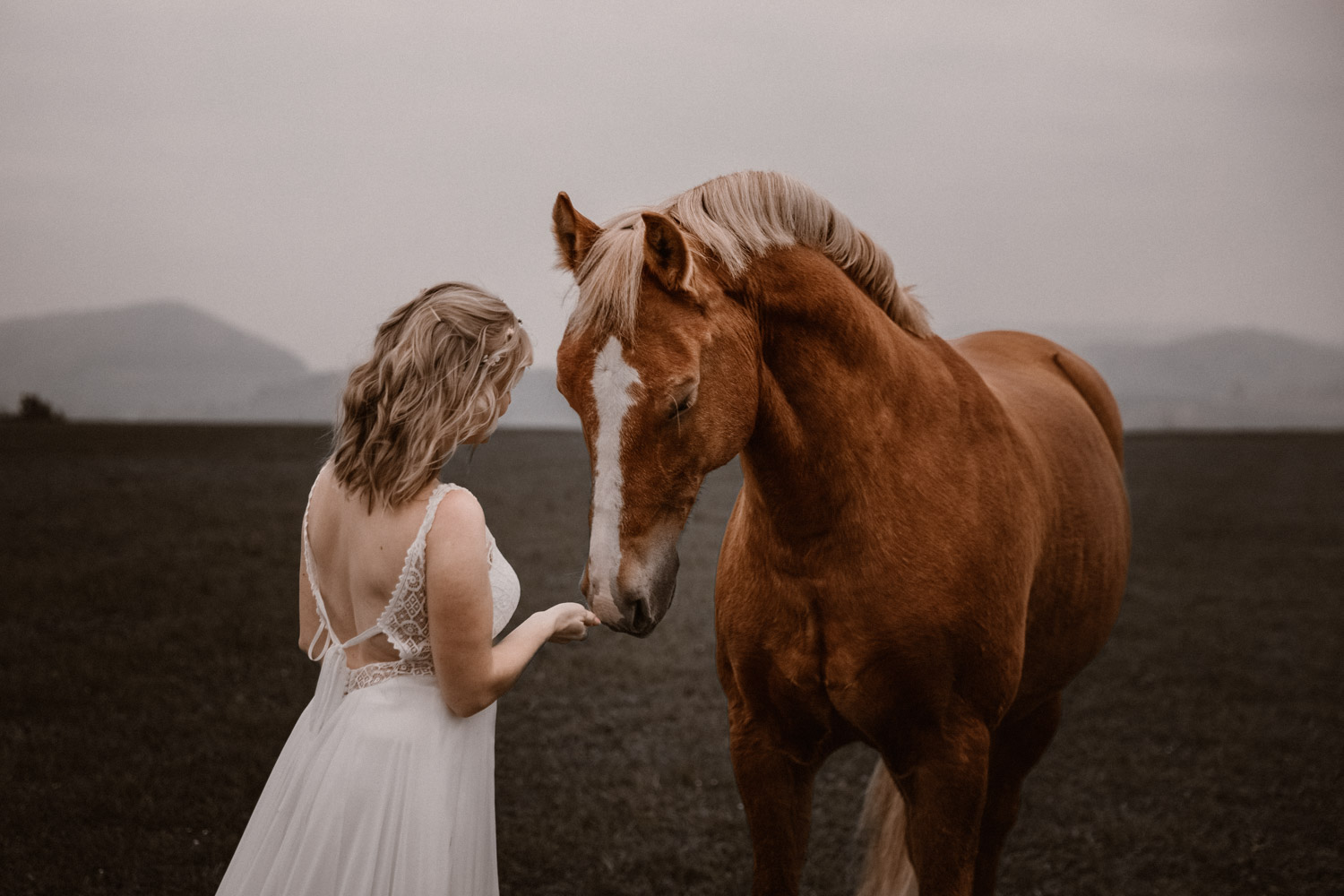 Ein Hochzeitsshooting mit Pferd, oder ein Pferdeshooting im Brautkleid… man mag es nennen wie man möchte. Viele haben mir schon erzählt, dass sie das unbedingt machen möchten, aber meistens ist es dann doch nicht zustande gekommen. Anouk aber hat Wort gehalten und so haben wir uns einige Monate nach ihrer Hochzeit getroffen, um sie – mittlerweile mit kleinem Babybauch 🙂 – zusammen mit dem frechen aber so liebeswürdigen Nils zu fotografieren. Bis kurz vor dem Shooting hatten wir noch keine konkrete Idee für eine Location, doch dann ist mir spontan etwas eingefallen, und nach einer kurzen Location-Scouting-Tour am Abend davor konnte es losgehen. Dank kurzen Fresspausen zwischendrin hat Freiberger Nils auch mit sehr viel (manchmal etwas zu viel) Motivation mitgemacht, und es sind glaube ich schöne, spezielle und unklassische Fotos einer Braut mit ihrem Pferd entstanden 🙂 Wer mich kennt, der weiss, dass man mir mit dem klassischen Braut im Prinzessinnenkleid + Pferd + Sonnenuntergang keine Begeisterung entlocken kann – zu oft gesehen, zu viel Klischee und zu wenig meinem Bild von Pferden entsprechend. Aber mit einem schlichten Kleid, etwas unglamourösem muddy look und einem durch viele gemeinsame Jahre eingeschweissten Paar bin ich voll dabei. Pferde sind keine Luxusaccessoires (ok, ein bisschen vielleicht schon 😉 ), sondern in erster Linie vierbeinige Partner, die einem durch alle Lebensphasen hindurch begleiten. Der nächste Lebensabschnitt sieht man hier schon etwas wachsen und ich wünsche dieser kleinen Familie alles Gute dafür!