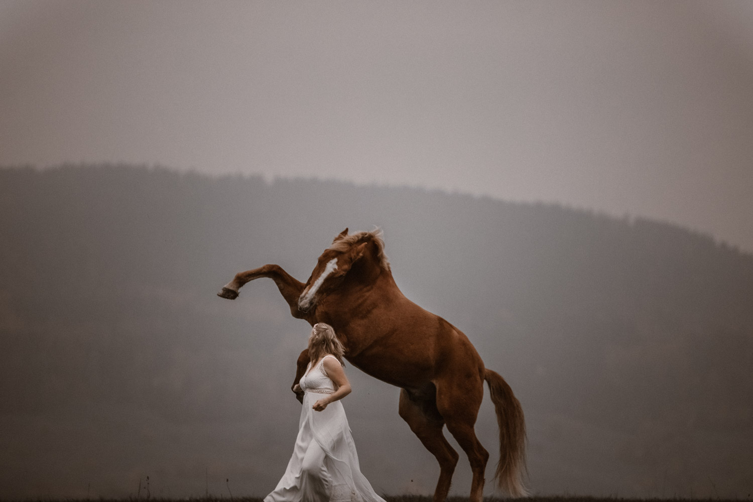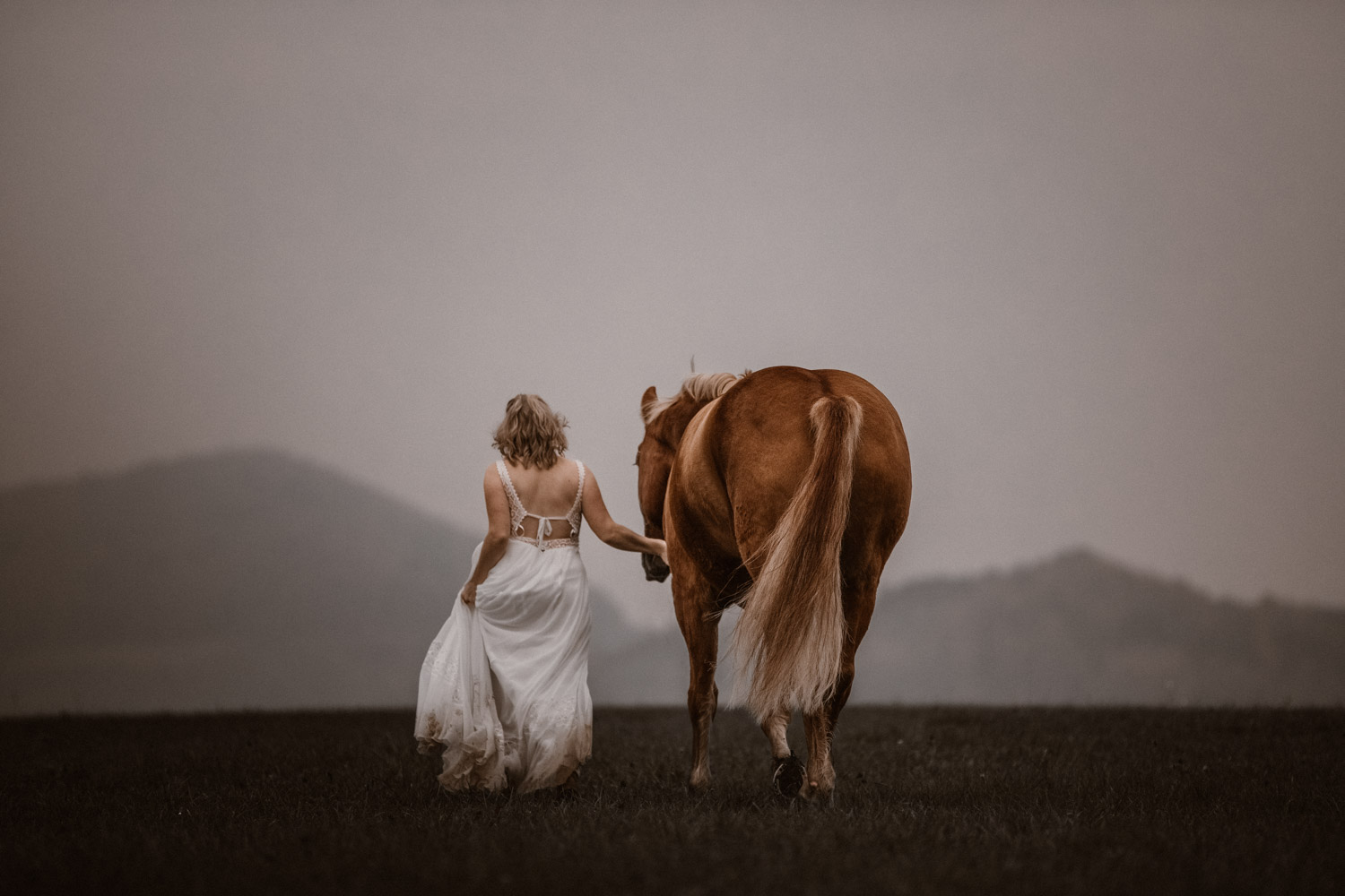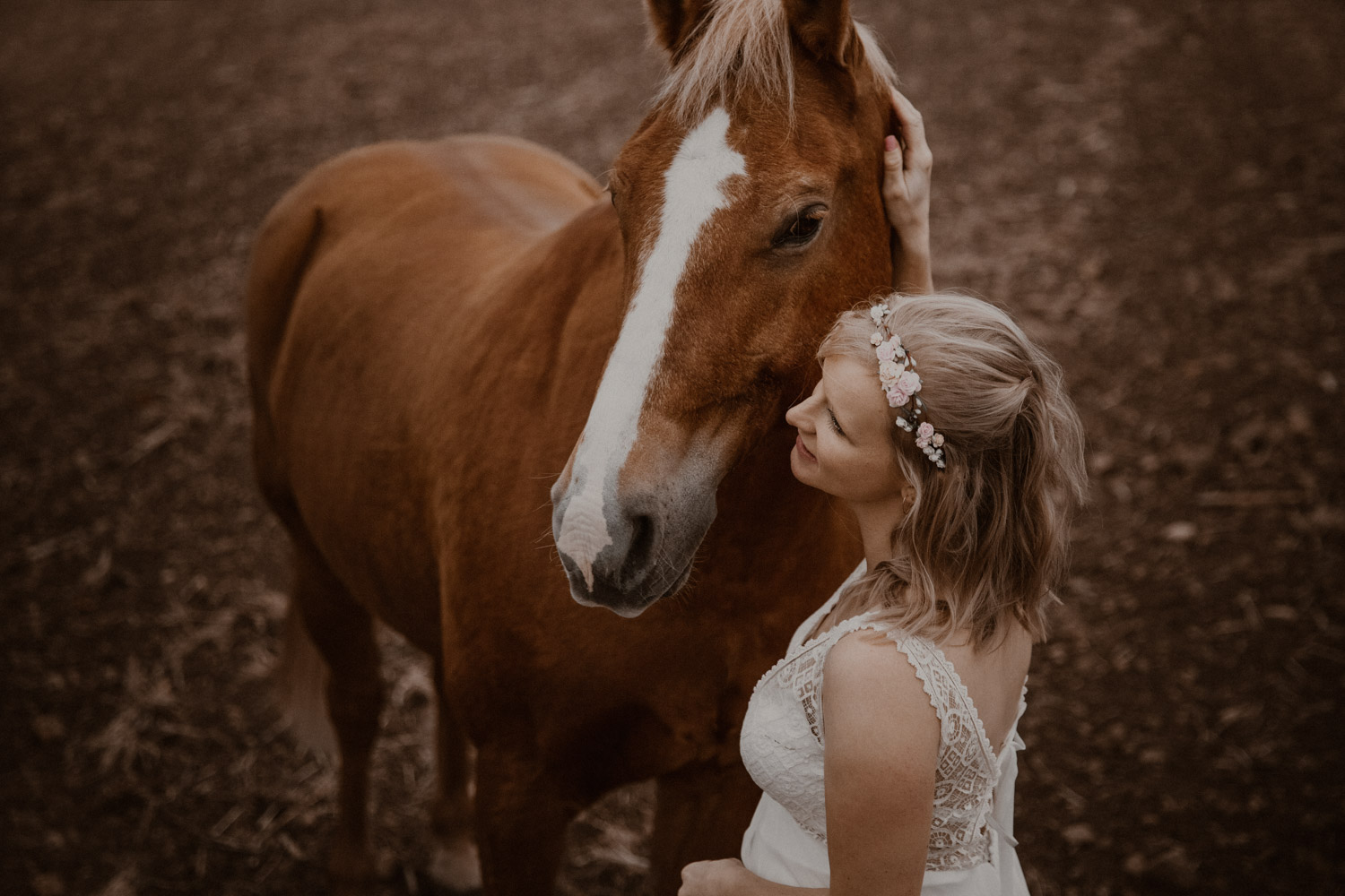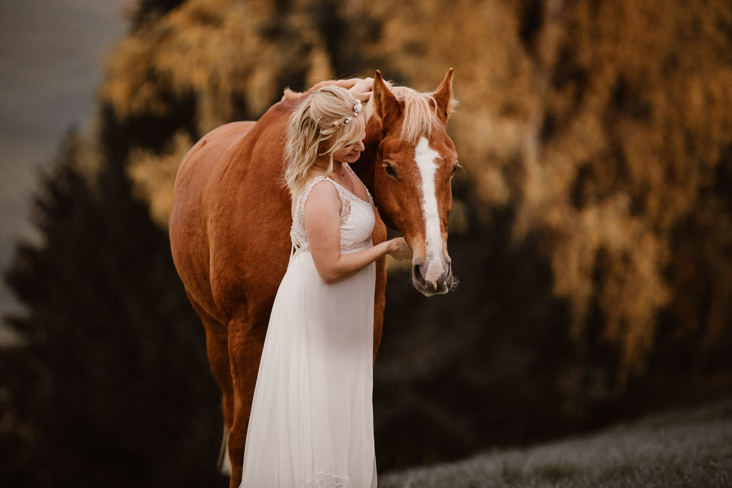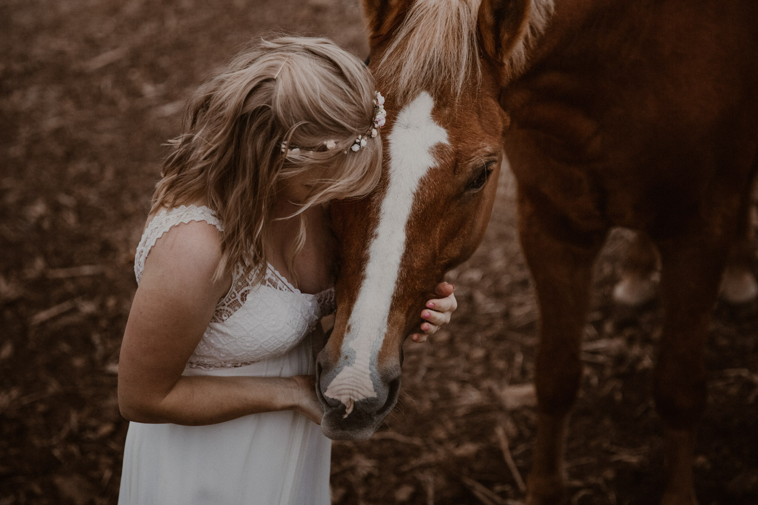 Ein Hochzeitsshooting mit Pferd, oder ein Pferdeshooting im Brautkleid… man mag es nennen wie man möchte. Viele haben mir schon erzählt, dass sie das unbedingt machen möchten, aber meistens ist es dann doch nicht zustande gekommen. Anouk aber hat Wort gehalten und so haben wir uns einige Monate nach ihrer Hochzeit getroffen, um sie – mittlerweile mit kleinem Babybauch 🙂 – zusammen mit dem frechen aber so liebeswürdigen Nils zu fotografieren. Bis kurz vor dem Shooting hatten wir noch keine konkrete Idee für eine Location, doch dann ist mir spontan etwas eingefallen, und nach einer kurzen Location-Scouting-Tour am Abend davor konnte es losgehen. Dank kurzen Fresspausen zwischendrin hat Freiberger Nils auch mit sehr viel (manchmal etwas zu viel) Motivation mitgemacht, und es sind glaube ich schöne, spezielle und unklassische Fotos einer Braut mit ihrem Pferd entstanden 🙂 Wer mich kennt, der weiss, dass man mir mit dem klassischen Braut im Prinzessinnenkleid + Pferd + Sonnenuntergang keine Begeisterung entlocken kann – zu oft gesehen, zu viel Klischee und zu wenig meinem Bild von Pferden entsprechend. Aber mit einem schlichten Kleid, etwas unglamourösem muddy look und einem durch viele gemeinsame Jahre eingeschweissten Paar bin ich voll dabei. Pferde sind keine Luxusaccessoires (ok, ein bisschen vielleicht schon 😉 ), sondern in erster Linie vierbeinige Partner, die einem durch alle Lebensphasen hindurch begleiten. Der nächste Lebensabschnitt sieht man hier schon etwas wachsen und ich wünsche dieser kleinen Familie alles Gute dafür!
