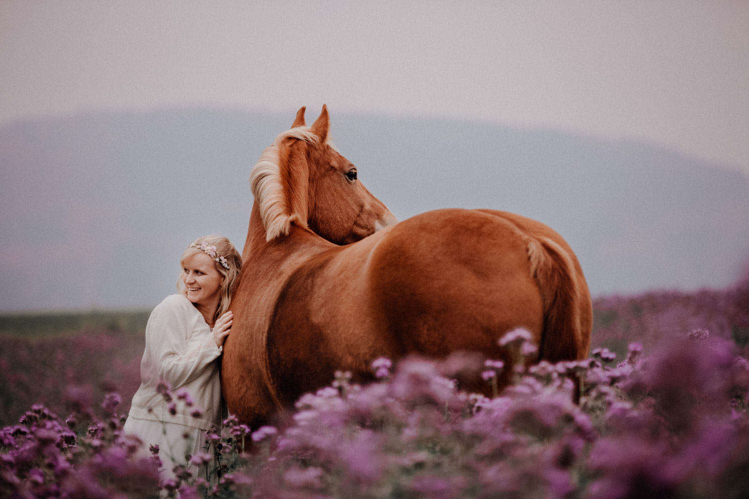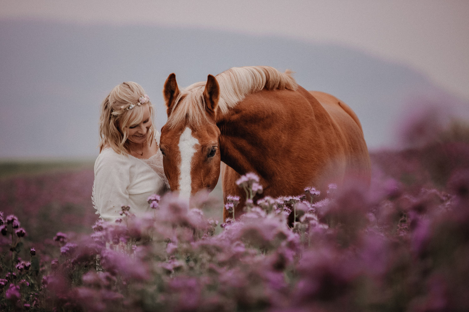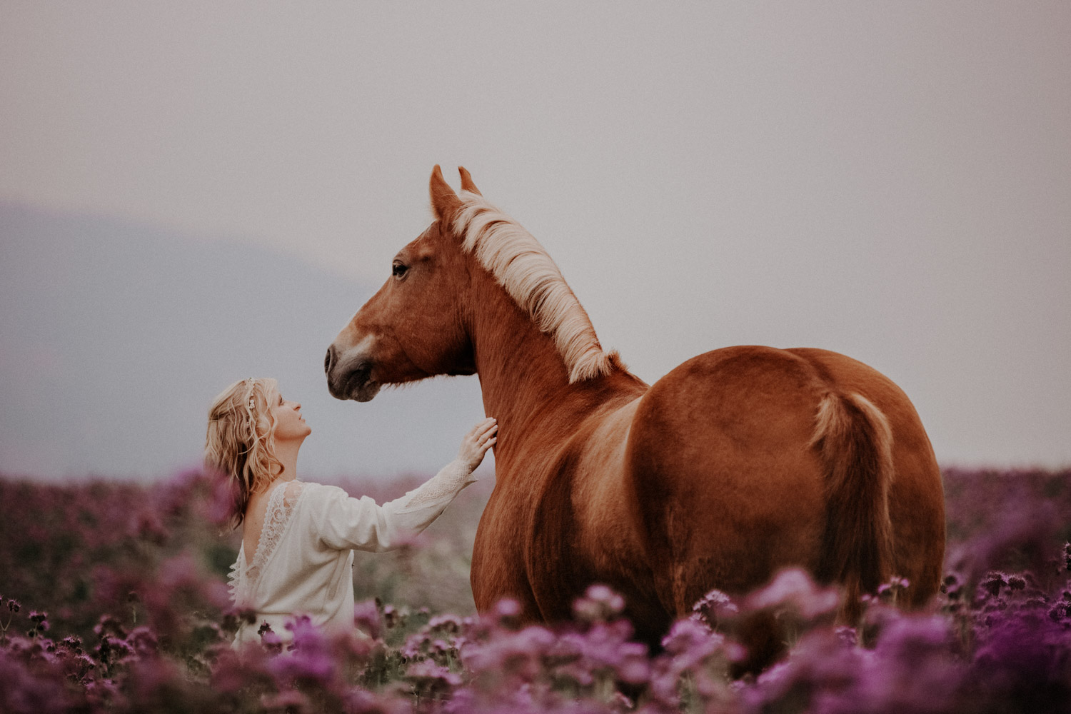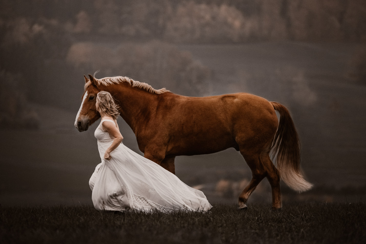 Ein Hochzeitsshooting mit Pferd, oder ein Pferdeshooting im Brautkleid… man mag es nennen wie man möchte. Viele haben mir schon erzählt, dass sie das unbedingt machen möchten, aber meistens ist es dann doch nicht zustande gekommen. Anouk aber hat Wort gehalten und so haben wir uns einige Monate nach ihrer Hochzeit getroffen, um sie – mittlerweile mit kleinem Babybauch 🙂 – zusammen mit dem frechen aber so liebeswürdigen Nils zu fotografieren. Bis kurz vor dem Shooting hatten wir noch keine konkrete Idee für eine Location, doch dann ist mir spontan etwas eingefallen, und nach einer kurzen Location-Scouting-Tour am Abend davor konnte es losgehen. Dank kurzen Fresspausen zwischendrin hat Freiberger Nils auch mit sehr viel (manchmal etwas zu viel) Motivation mitgemacht, und es sind glaube ich schöne, spezielle und unklassische Fotos einer Braut mit ihrem Pferd entstanden 🙂 Wer mich kennt, der weiss, dass man mir mit dem klassischen Braut im Prinzessinnenkleid + Pferd + Sonnenuntergang keine Begeisterung entlocken kann – zu oft gesehen, zu viel Klischee und zu wenig meinem Bild von Pferden entsprechend. Aber mit einem schlichten Kleid, etwas unglamourösem muddy look und einem durch viele gemeinsame Jahre eingeschweissten Paar bin ich voll dabei. Pferde sind keine Luxusaccessoires (ok, ein bisschen vielleicht schon 😉 ), sondern in erster Linie vierbeinige Partner, die einem durch alle Lebensphasen hindurch begleiten. Der nächste Lebensabschnitt sieht man hier schon etwas wachsen und ich wünsche dieser kleinen Familie alles Gute dafür!