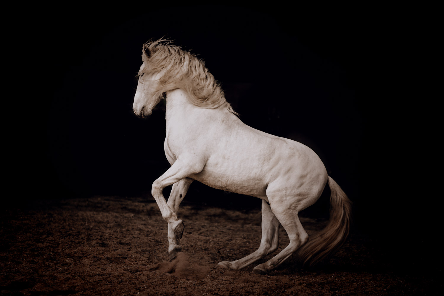 Am Abend hatten wir ein Date – mit dem berühmten Stall mit der gelben Wand. Helene hatte vor vielen Jahren dort einmal als Praktikantin gearbeitet und hat mir schon viel von diesem Stall vorgeschwärmt. Als wir nach kurzem Herumirren da angekommen waren, verstand ich auch warum: Er war einfach wunderschön! Die Bewohner stehen dem Stall in nichts nach, atemberaubende Pferde und Menschen, die einen tollen Umgang mit ihren Tieren pflegen. Jugeton ist ein Andalusier-Hengst wie er im Buche steht, und trotz seines jungen Alters und der Tatsache, dass er erst seit wenigen Tagen dort zu Hause war, spielte er absolut problemlos mit und schenkte uns mit seiner Besitzerin Carmen unglaubliche Bilder. Kurz danach war auch Opio der Schimmel sauber, und wir durften ihn mit seiner Reiterin Ricarda beim freien Spiel auf dem Reitplatz (vor der gelben Wand ;)) fotografieren. Man hat ihnen angemerkt, dass sie das nicht zu ersten Mal machen – die zwei haben einfach toll harmoniert und ich fand es wieder einmal schön zu beobachten, wie man trotz fehlender gemeinsamer Sprache mit Pferden kommunizieren kann, und das auch ohne Hilfsmittel.