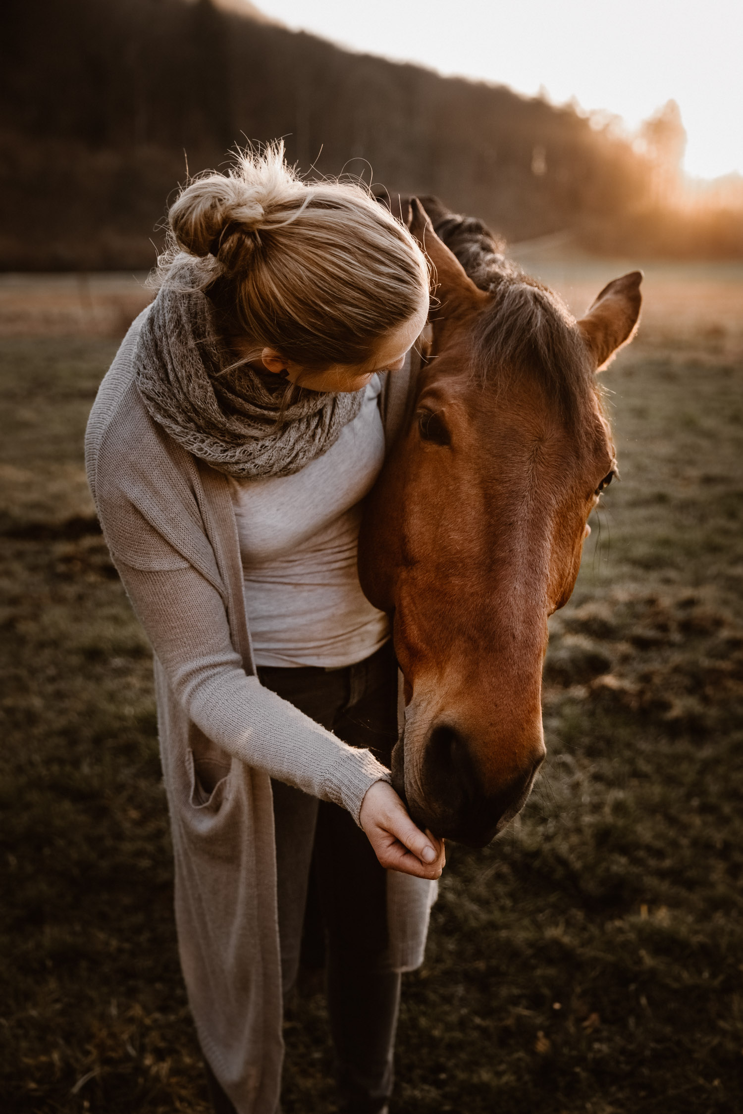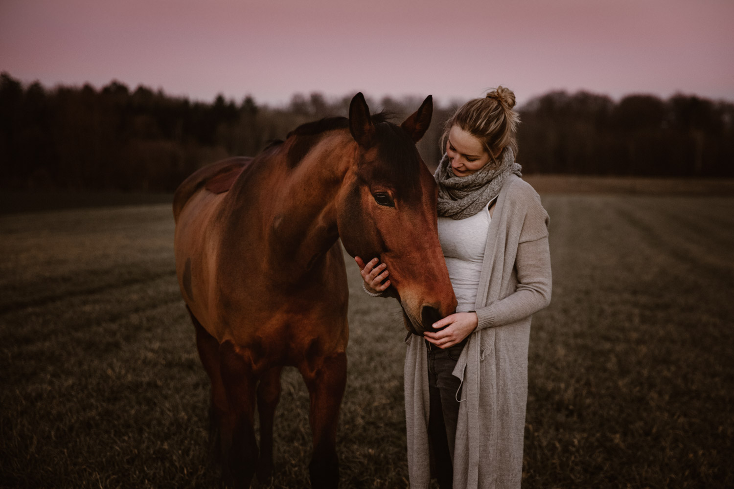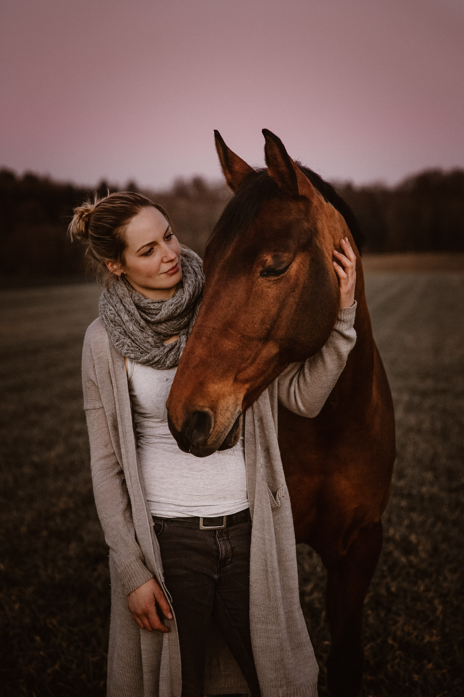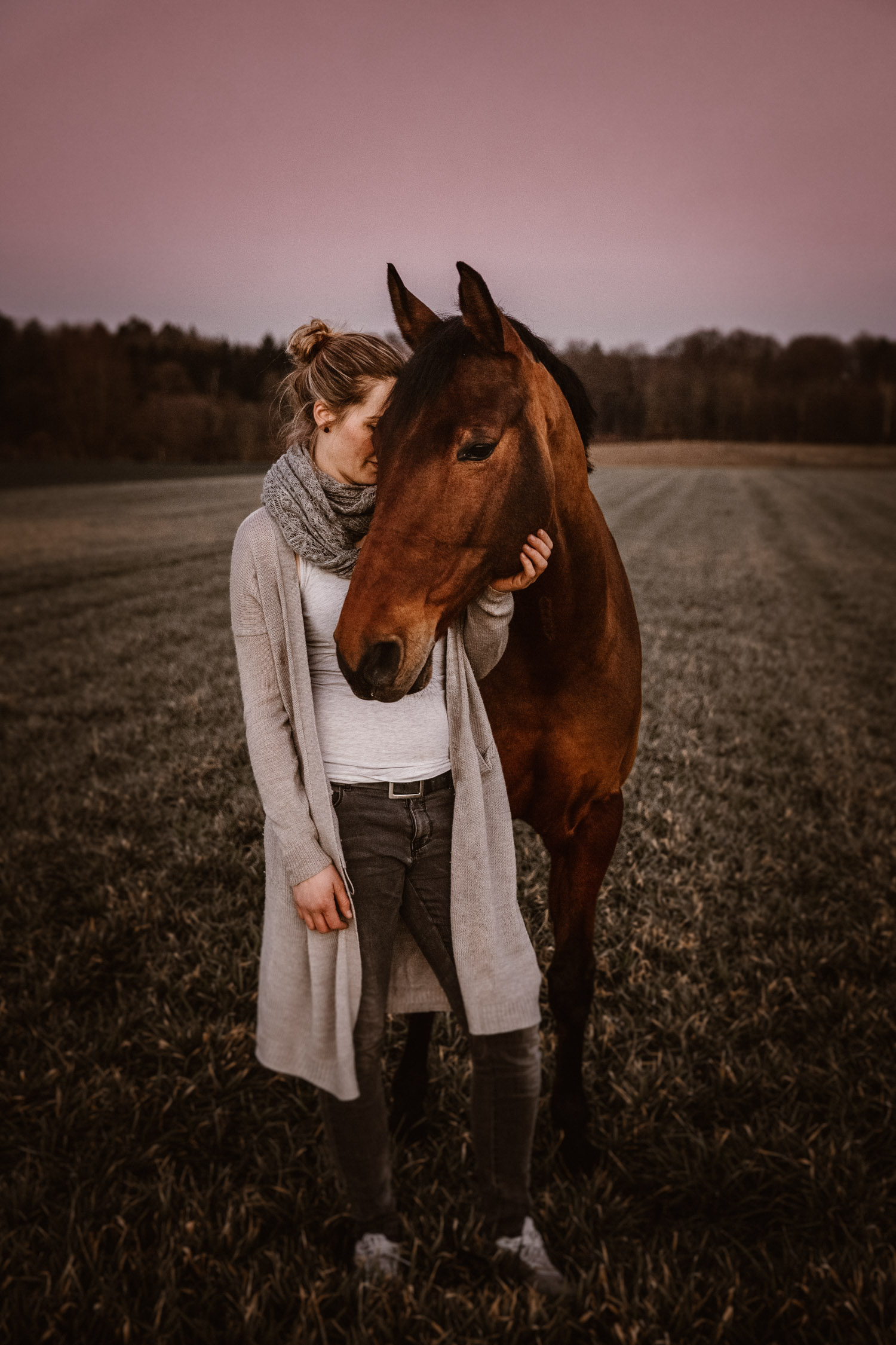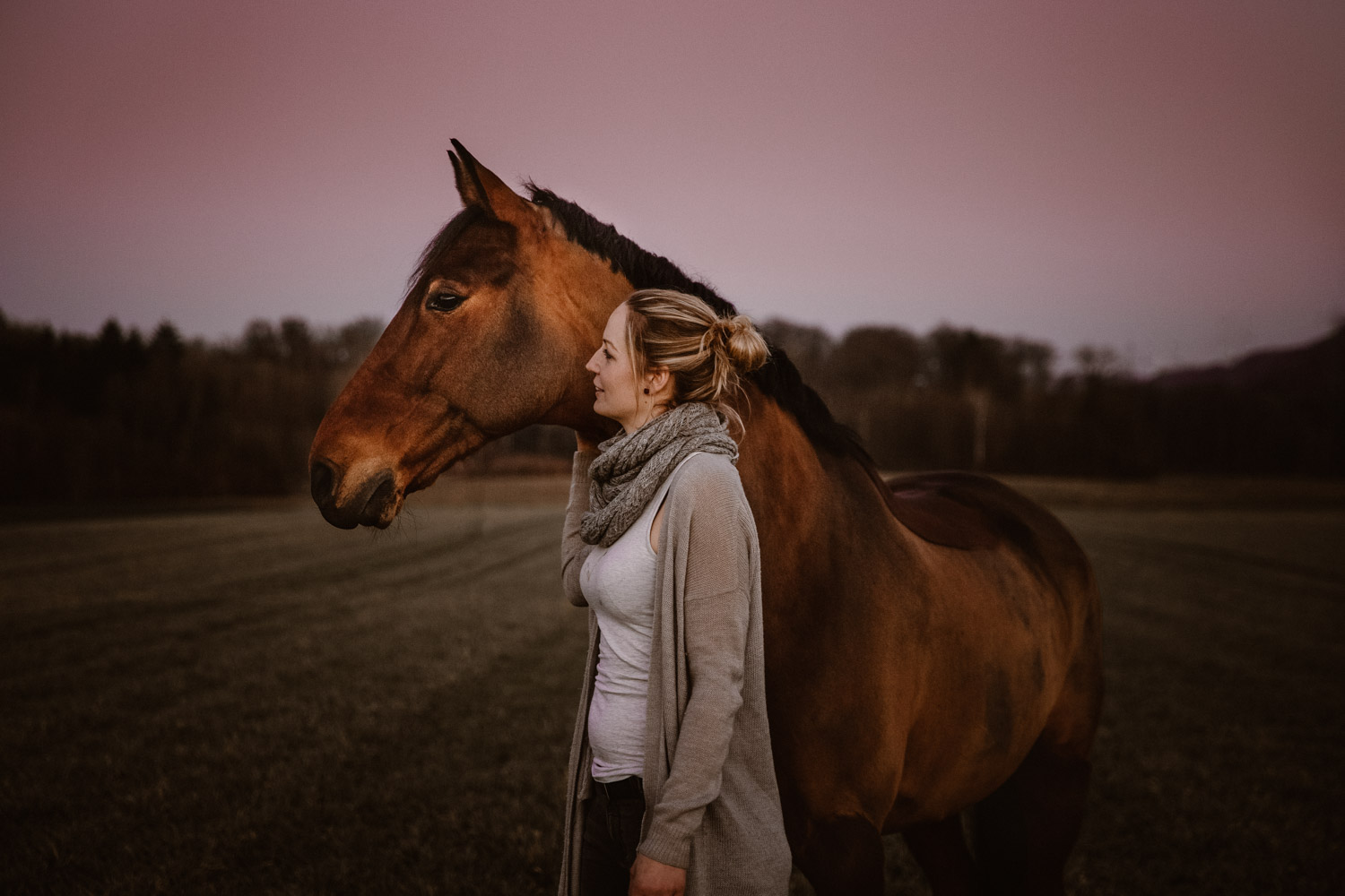 Ich werde von “normalen” Menschen (aka Nicht-Fotografen) oft etwas schräg angeschaut, wenn ich mich für irgendwelche Licht-Situationen begeistern kann wie sonst für kaum etwas. Aber – andere Fotografen werden mir beipflichten, wenn ich sage: Licht ist einfach alles. Fotografie heisst ja nicht umsonst auf Deutsch übersetzt “Malen mit Licht”, so kitschig das auch tönen mag. Ohne Licht gibt es keine Fotografie; es ist das Erste, wonach ich Ausschau halte, wenn ich Locations suche. Und so ritt ich vor Kurzem auf einem Ausritt kurz nach Sonnenuntergang an einer Wiese vorbei, an der ich schon unzählige Male vorbeigeritten war. An sich eine wirklich normale Wiese, aber das Licht war einfach unglaublich. Der Himmel färbte sich in den spektakulärsten Farben, und in Kombination mit dem recht speziellen Grün der Wiese (ja, Grüntöne von Gras verändern sich über die Jahreszeiten hinweg) sah es einfach atemberaubend schön aus. Ich bin sonst nicht so der Fan von knalligen und kitschigen Farben, aber da wollte ich einfach unbedingt fotografieren – ein Pferdeshooting während der Blue Hour ( = die Zeit gerade nach dem Sonnenuntergang). Dazu brauchte es aber genau dieses wolkenlose und sonnige Wetter, und so blieb mir nicht viel Zeit, denn der frühe Frühling ist ja manchmal doch sehr launenhaft. Fest entschlossen habe ich also auf Facebook & Instagram ein Shooting ausgeschrieben, war aber nicht allzu optimistisch. Aber – ich wurde fündig! Jenni & Andi kenne ich schon länger von Turnieren und anderen Gelegenheiten, aber fotografiert haben wir noch nie zusammen. Sie wollte aber schon lange mal, und so hat sie die Gelegenheit genutzt. Nach ein bisschen “Aufwärmshooting” an einem anderen Ort in der Nähe (bei wunderschönstem Gegenlicht) sind wir zu der besagten Wiese gefahren und wurden mit einem atemberaubend gefärbten Himmel beglückt. Am Anfang war er orange, dann rosa, und zum Schluss blau – einfach wunderbar! Dem Ganzen die Krone aufgesetzt hat Andi; trotz Gras am Boden hat so entspannt und zufrieden mitgemacht. Ich freue mich einfach immer wieder, wenn es gelingt, dass die Pferde bei den Fotoshootings (deren Zweck sie ja nun wirklich nicht ganz nachvollziehen können) vertrauensvoll und ruhig mitarbeiten. Über die Jahre habe ich in all den Shootings sehr viel darüber lernen dürfen, wie man die Aufmerksamkeit der Pferde gewinnt und “intime” Bilder machen kann – und das funktioniert nicht mit rascheln, hüpfen und schreien. Danke Jenni, Andi und den lieben Helfern – es war mir eine Freude! 🙂