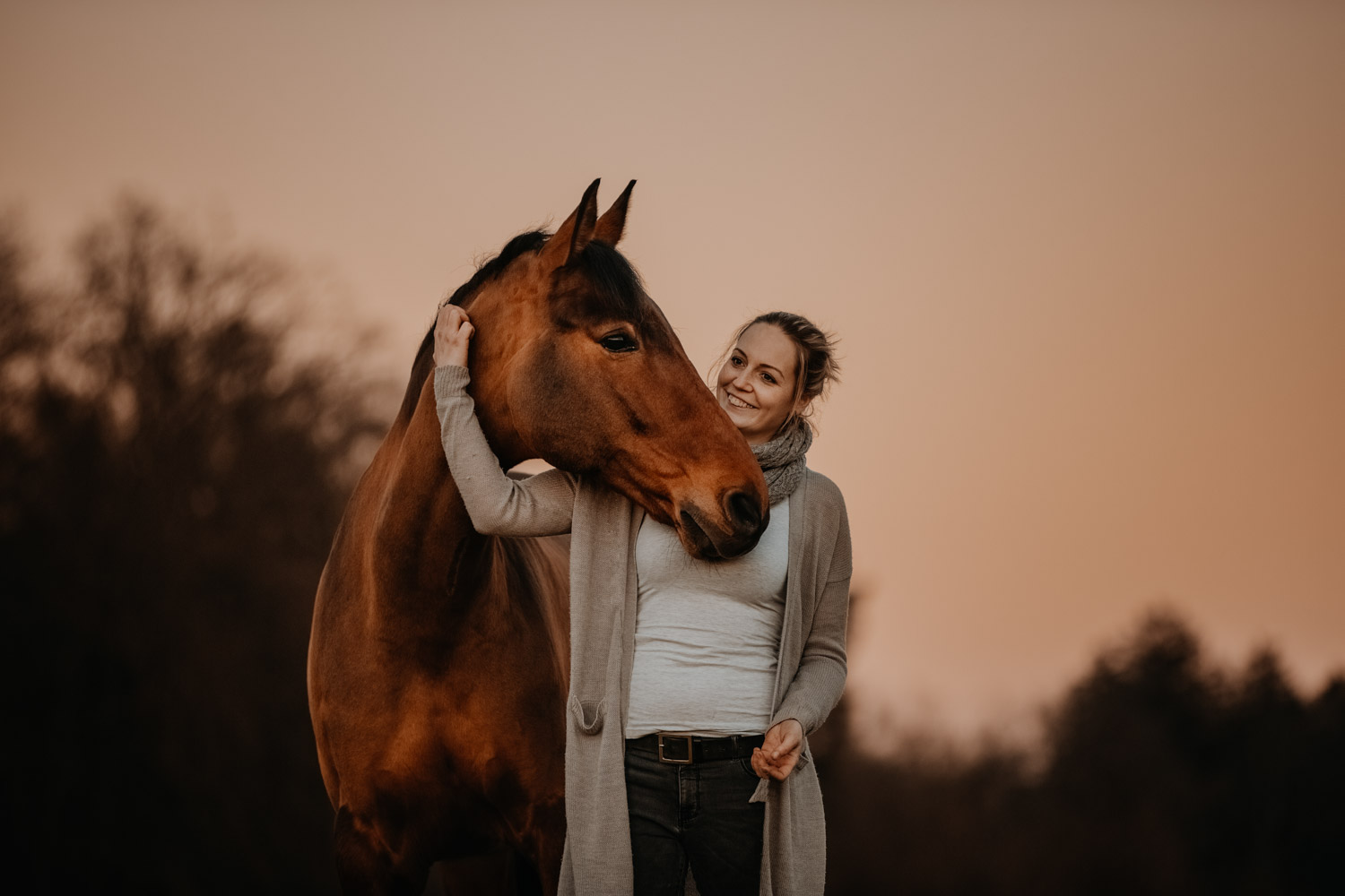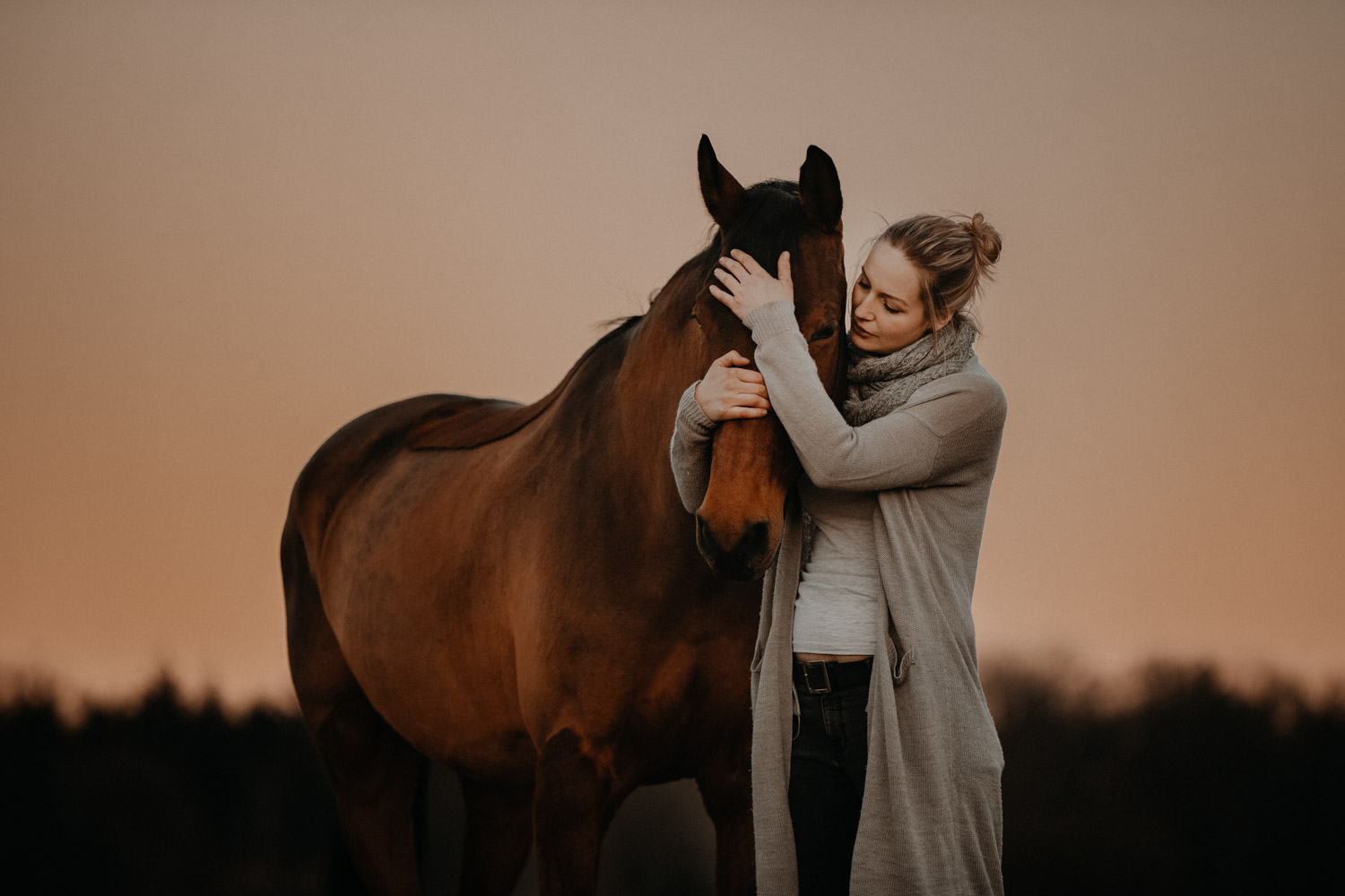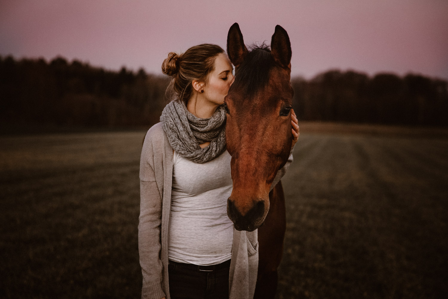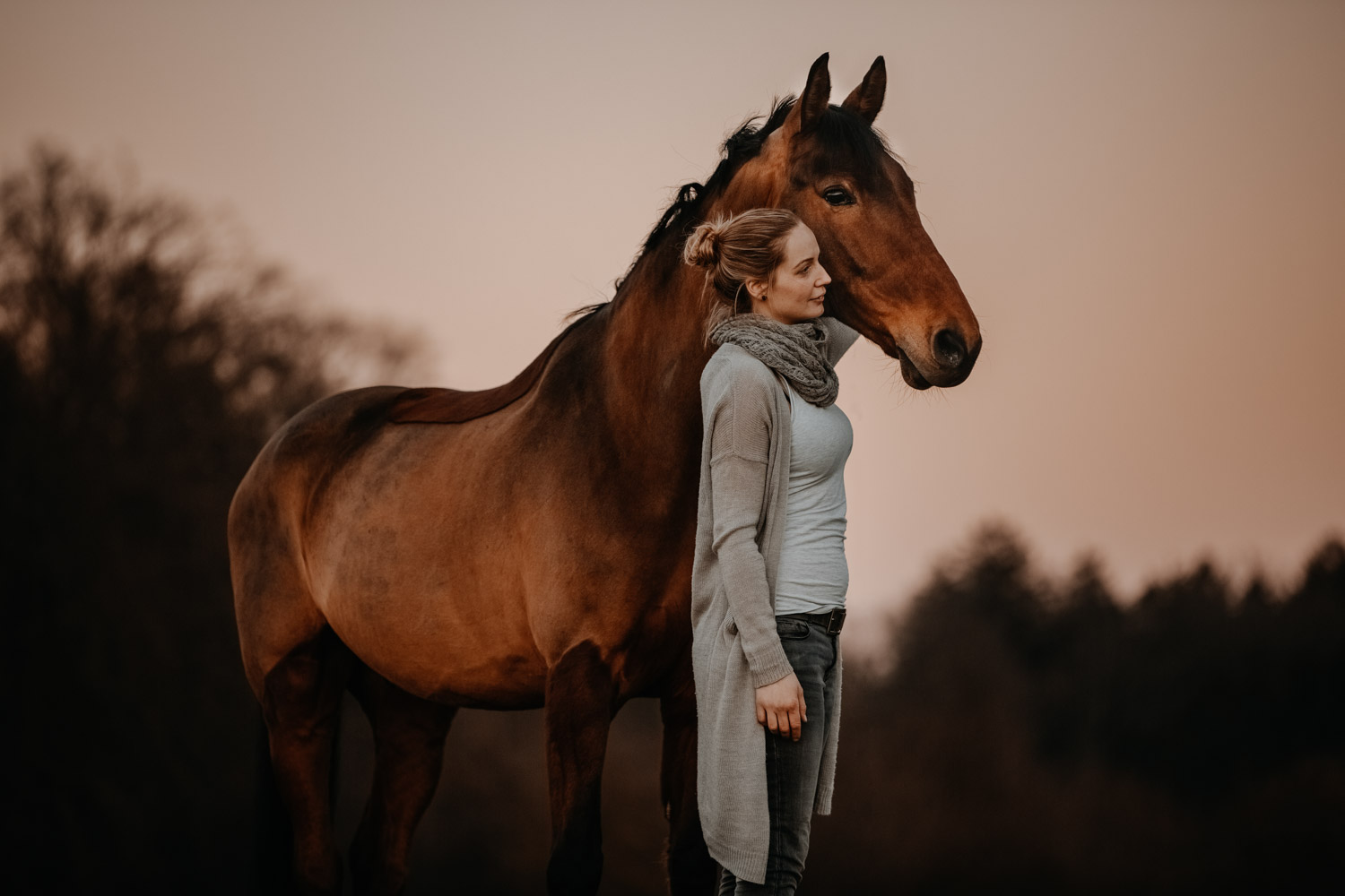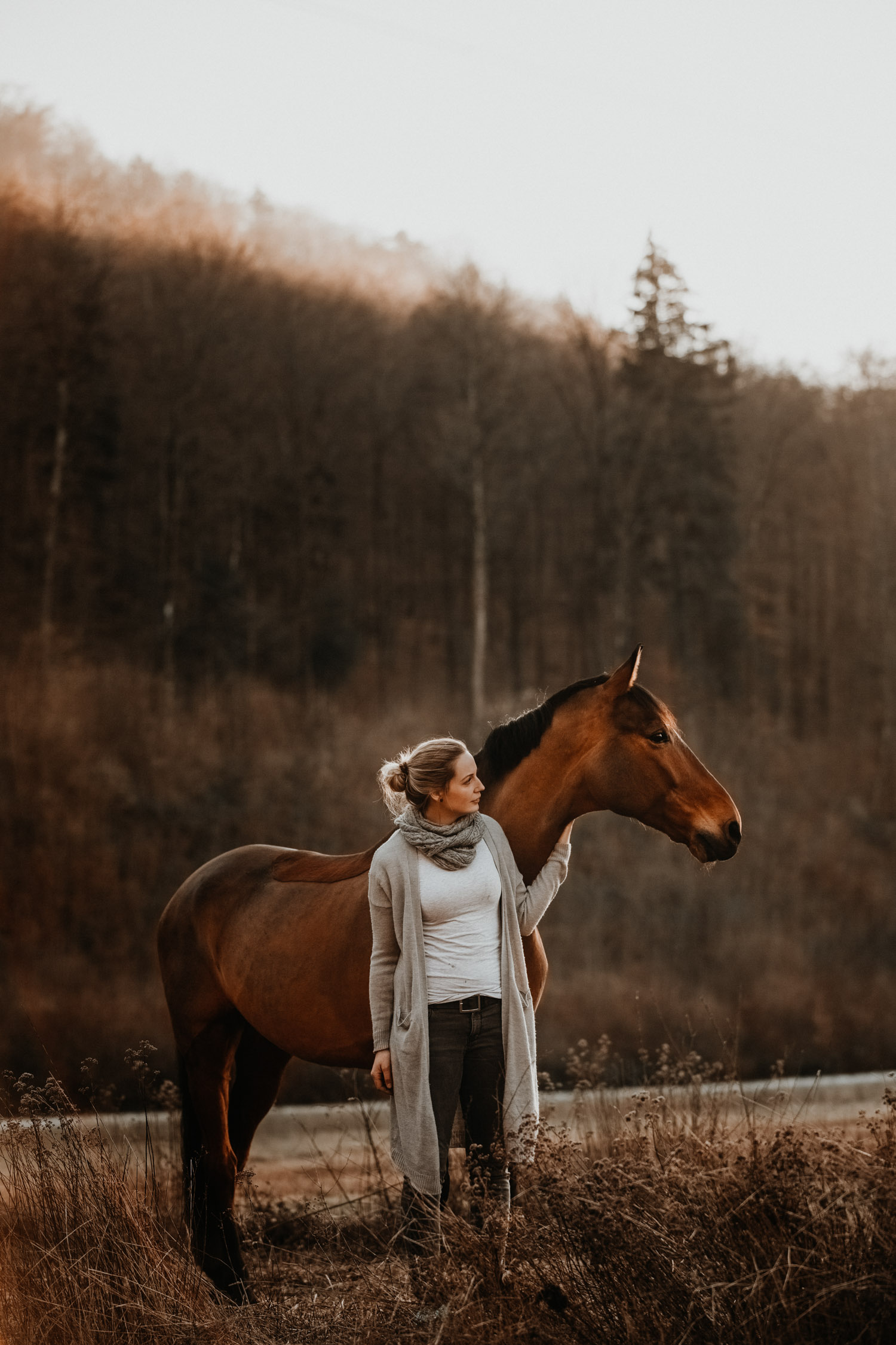 Ich werde von “normalen” Menschen (aka Nicht-Fotografen) oft etwas schräg angeschaut, wenn ich mich für irgendwelche Licht-Situationen begeistern kann wie sonst für kaum etwas. Aber – andere Fotografen werden mir beipflichten, wenn ich sage: Licht ist einfach alles. Fotografie heisst ja nicht umsonst auf Deutsch übersetzt “Malen mit Licht”, so kitschig das auch tönen mag. Ohne Licht gibt es keine Fotografie; es ist das Erste, wonach ich Ausschau halte, wenn ich Locations suche. Und so ritt ich vor Kurzem auf einem Ausritt kurz nach Sonnenuntergang an einer Wiese vorbei, an der ich schon unzählige Male vorbeigeritten war. An sich eine wirklich normale Wiese, aber das Licht war einfach unglaublich. Der Himmel färbte sich in den spektakulärsten Farben, und in Kombination mit dem recht speziellen Grün der Wiese (ja, Grüntöne von Gras verändern sich über die Jahreszeiten hinweg) sah es einfach atemberaubend schön aus. Ich bin sonst nicht so der Fan von knalligen und kitschigen Farben, aber da wollte ich einfach unbedingt fotografieren – ein Pferdeshooting während der Blue Hour ( = die Zeit gerade nach dem Sonnenuntergang). Dazu brauchte es aber genau dieses wolkenlose und sonnige Wetter, und so blieb mir nicht viel Zeit, denn der frühe Frühling ist ja manchmal doch sehr launenhaft. Fest entschlossen habe ich also auf Facebook & Instagram ein Shooting ausgeschrieben, war aber nicht allzu optimistisch. Aber – ich wurde fündig! Jenni & Andi kenne ich schon länger von Turnieren und anderen Gelegenheiten, aber fotografiert haben wir noch nie zusammen. Sie wollte aber schon lange mal, und so hat sie die Gelegenheit genutzt. Nach ein bisschen “Aufwärmshooting” an einem anderen Ort in der Nähe (bei wunderschönstem Gegenlicht) sind wir zu der besagten Wiese gefahren und wurden mit einem atemberaubend gefärbten Himmel beglückt. Am Anfang war er orange, dann rosa, und zum Schluss blau – einfach wunderbar! Dem Ganzen die Krone aufgesetzt hat Andi; trotz Gras am Boden hat so entspannt und zufrieden mitgemacht. Ich freue mich einfach immer wieder, wenn es gelingt, dass die Pferde bei den Fotoshootings (deren Zweck sie ja nun wirklich nicht ganz nachvollziehen können) vertrauensvoll und ruhig mitarbeiten. Über die Jahre habe ich in all den Shootings sehr viel darüber lernen dürfen, wie man die Aufmerksamkeit der Pferde gewinnt und “intime” Bilder machen kann – und das funktioniert nicht mit rascheln, hüpfen und schreien. Danke Jenni, Andi und den lieben Helfern – es war mir eine Freude! 🙂