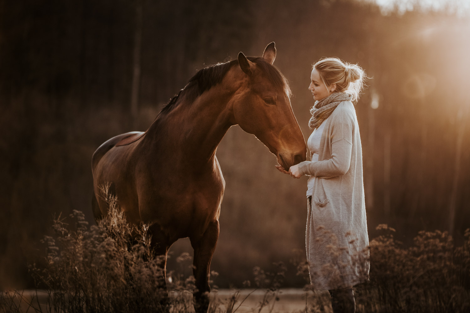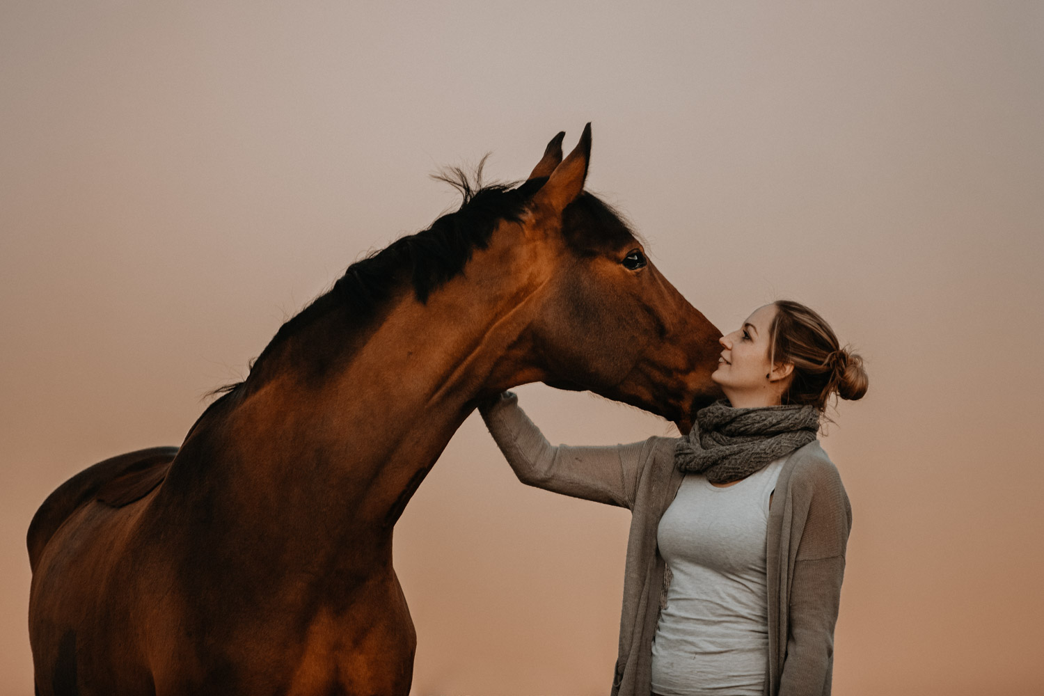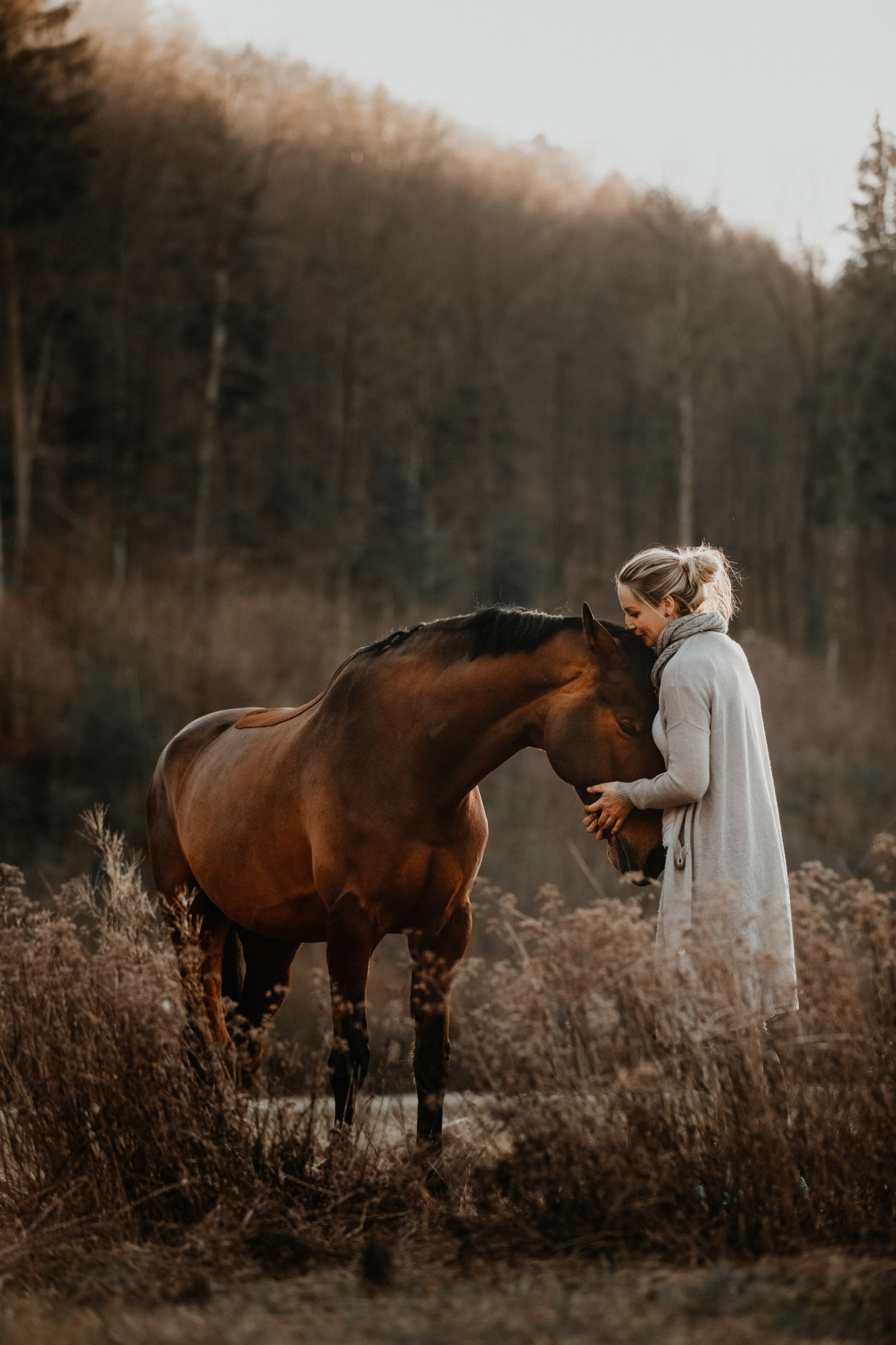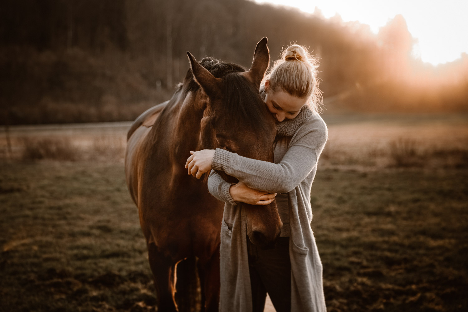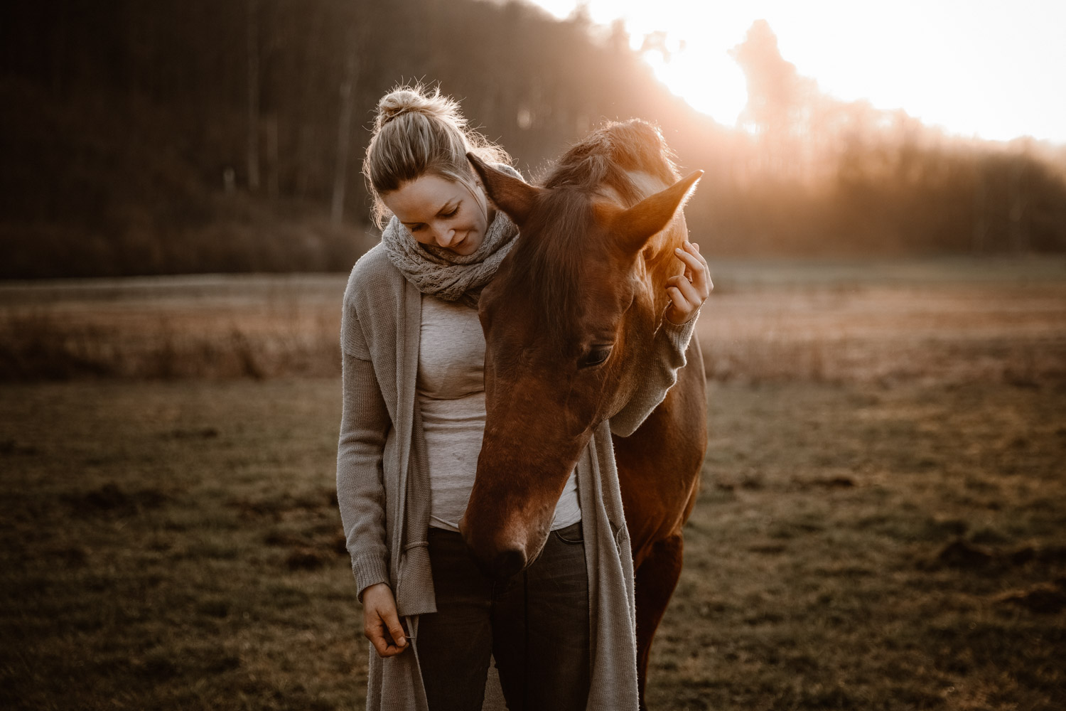 Ich werde von “normalen” Menschen (aka Nicht-Fotografen) oft etwas schräg angeschaut, wenn ich mich für irgendwelche Licht-Situationen begeistern kann wie sonst für kaum etwas. Aber – andere Fotografen werden mir beipflichten, wenn ich sage: Licht ist einfach alles. Fotografie heisst ja nicht umsonst auf Deutsch übersetzt “Malen mit Licht”, so kitschig das auch tönen mag. Ohne Licht gibt es keine Fotografie; es ist das Erste, wonach ich Ausschau halte, wenn ich Locations suche. Und so ritt ich vor Kurzem auf einem Ausritt kurz nach Sonnenuntergang an einer Wiese vorbei, an der ich schon unzählige Male vorbeigeritten war. An sich eine wirklich normale Wiese, aber das Licht war einfach unglaublich. Der Himmel färbte sich in den spektakulärsten Farben, und in Kombination mit dem recht speziellen Grün der Wiese (ja, Grüntöne von Gras verändern sich über die Jahreszeiten hinweg) sah es einfach atemberaubend schön aus. Ich bin sonst nicht so der Fan von knalligen und kitschigen Farben, aber da wollte ich einfach unbedingt fotografieren – ein Pferdeshooting während der Blue Hour ( = die Zeit gerade nach dem Sonnenuntergang). Dazu brauchte es aber genau dieses wolkenlose und sonnige Wetter, und so blieb mir nicht viel Zeit, denn der frühe Frühling ist ja manchmal doch sehr launenhaft. Fest entschlossen habe ich also auf Facebook & Instagram ein Shooting ausgeschrieben, war aber nicht allzu optimistisch. Aber – ich wurde fündig! Jenni & Andi kenne ich schon länger von Turnieren und anderen Gelegenheiten, aber fotografiert haben wir noch nie zusammen. Sie wollte aber schon lange mal, und so hat sie die Gelegenheit genutzt. Nach ein bisschen “Aufwärmshooting” an einem anderen Ort in der Nähe (bei wunderschönstem Gegenlicht) sind wir zu der besagten Wiese gefahren und wurden mit einem atemberaubend gefärbten Himmel beglückt. Am Anfang war er orange, dann rosa, und zum Schluss blau – einfach wunderbar! Dem Ganzen die Krone aufgesetzt hat Andi; trotz Gras am Boden hat so entspannt und zufrieden mitgemacht. Ich freue mich einfach immer wieder, wenn es gelingt, dass die Pferde bei den Fotoshootings (deren Zweck sie ja nun wirklich nicht ganz nachvollziehen können) vertrauensvoll und ruhig mitarbeiten. Über die Jahre habe ich in all den Shootings sehr viel darüber lernen dürfen, wie man die Aufmerksamkeit der Pferde gewinnt und “intime” Bilder machen kann – und das funktioniert nicht mit rascheln, hüpfen und schreien. Danke Jenni, Andi und den lieben Helfern – es war mir eine Freude! 🙂