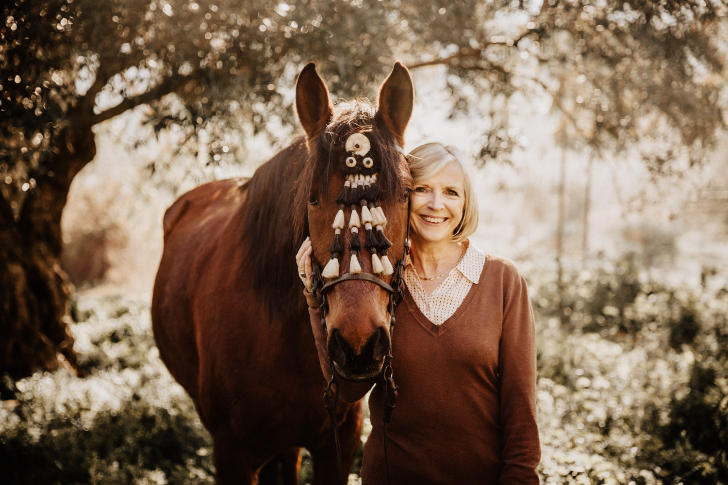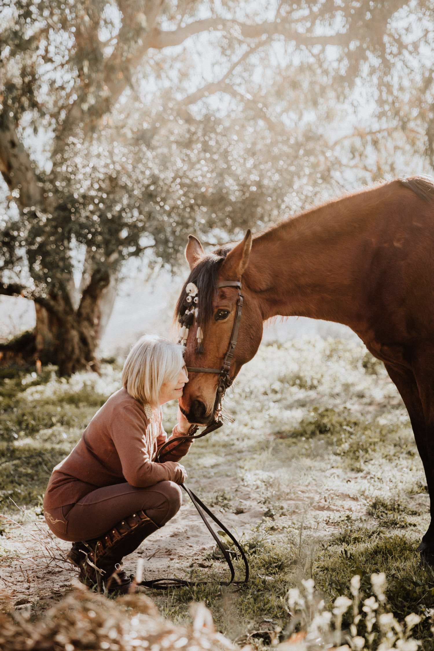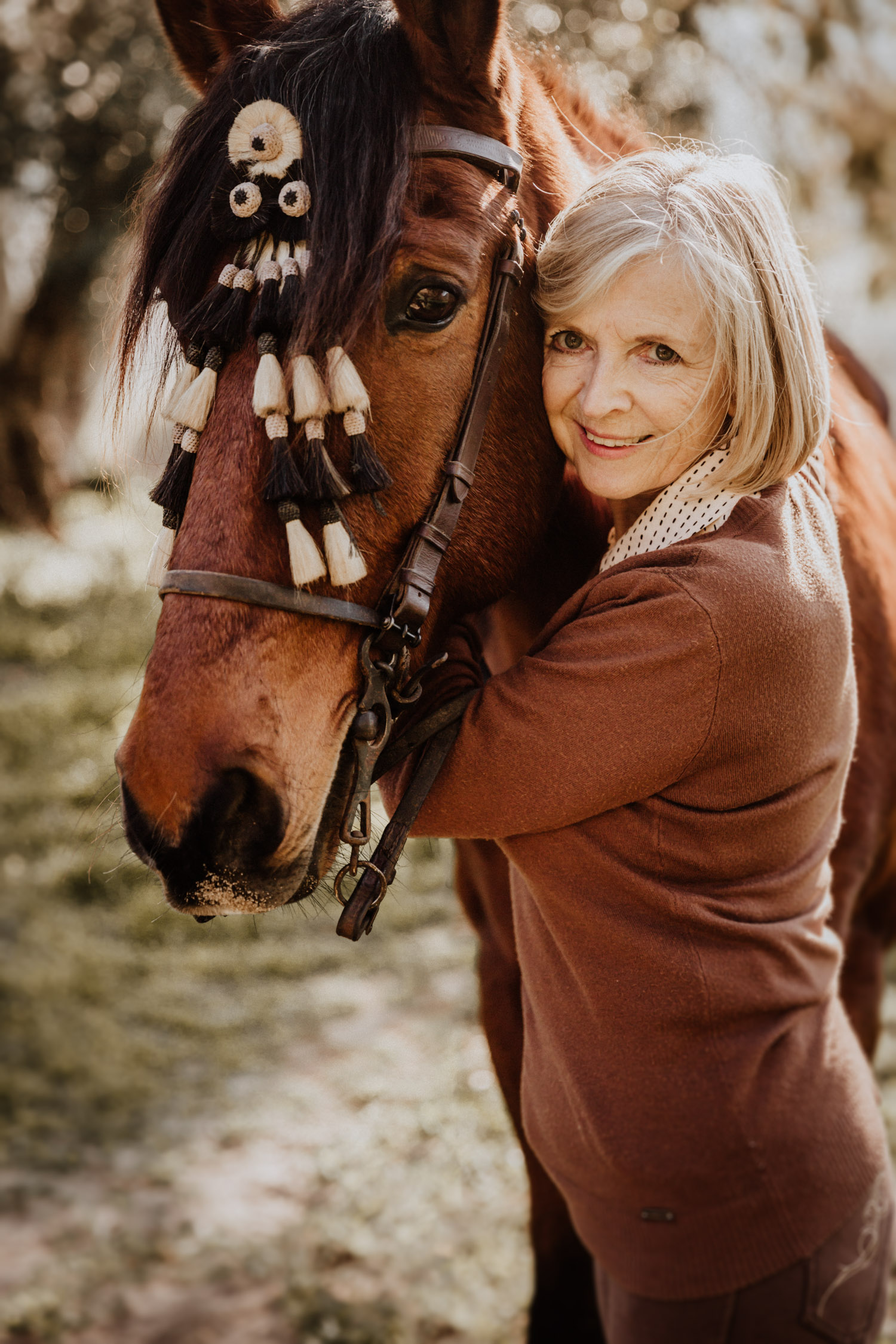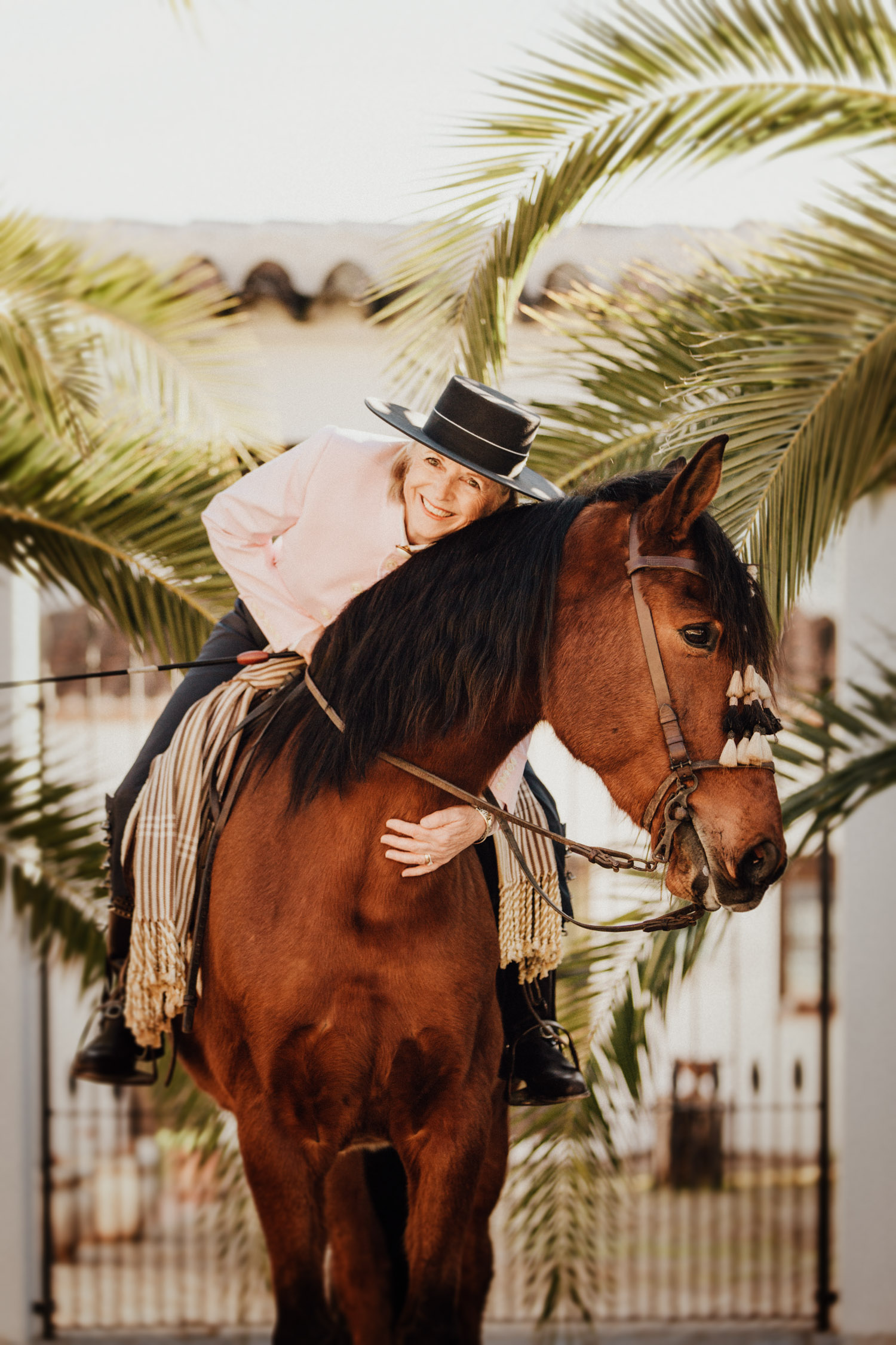 Kathy kommt ursprünglich aus England und hat in ihrem Leben schon einige Pferde besessen. Mittlerweile wohnt sie mit ihrem Mann in Spanien, an ihrer Seite ist Cortez – ein spanischer Wallach. Diese zwei haben Helene’s und mein Herz ganz besonders erobert, denn selten sieht man auch als Aussenstehender so offensichtlich auf den ersten Blick, dass Pferd und Mensch so perfekt zusammenpassen. Kathy hat mir erzählt, dass sie Cortez schon fast verkauft hat weil sie sich gesundheitlich einfach nicht mehr in der Lage gefühlt hat, ein Pferd zu besitzen und sich darum zu kümmern, aber letztendlich hat sie es doch nicht übers Herz gebracht. Cortez passt mit einer Engelsgeduld auf sie auf, und sie ist ihm dafür von Herzen dankbar. “Weiss du”, hat sie mir erklärt, “er mag es nicht, wenn man ihm Dinge befiehlt. Ich bitte ihn immer höflich. Und manchmal mag er es, einfach nur gestreichelt zu werden.” Das haben die zwei während unserem Shooting ausführlich gezeigt und so war es, wie es immer sein sollte: Ruhig, entspannt, friedlich.