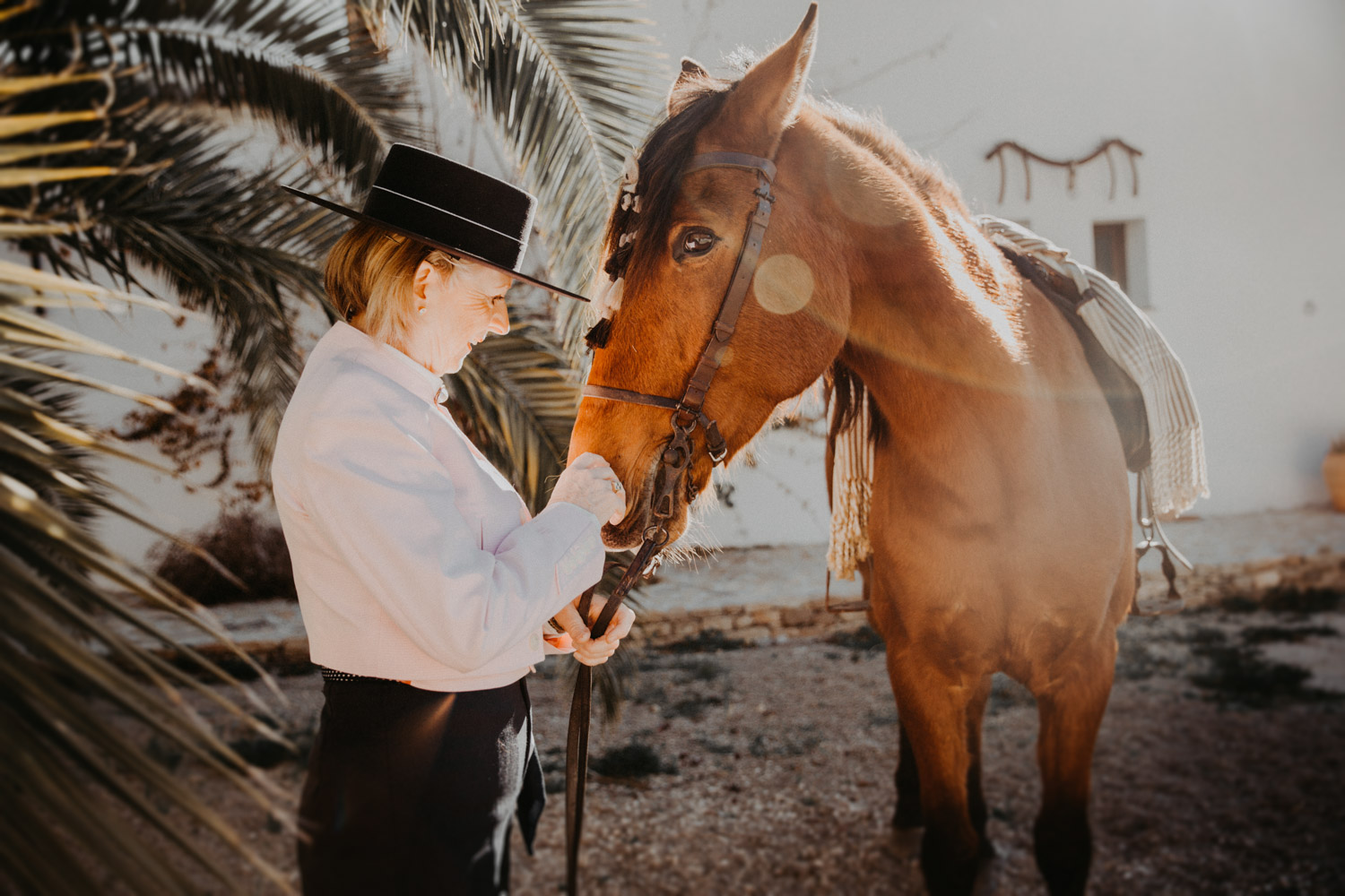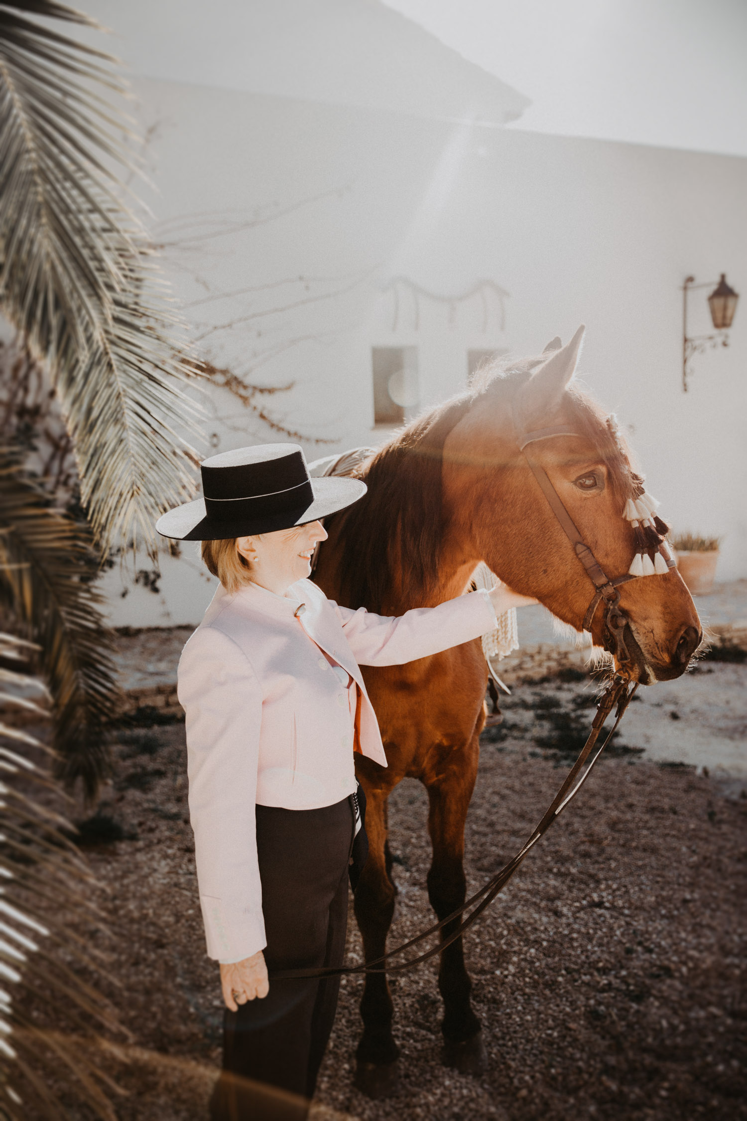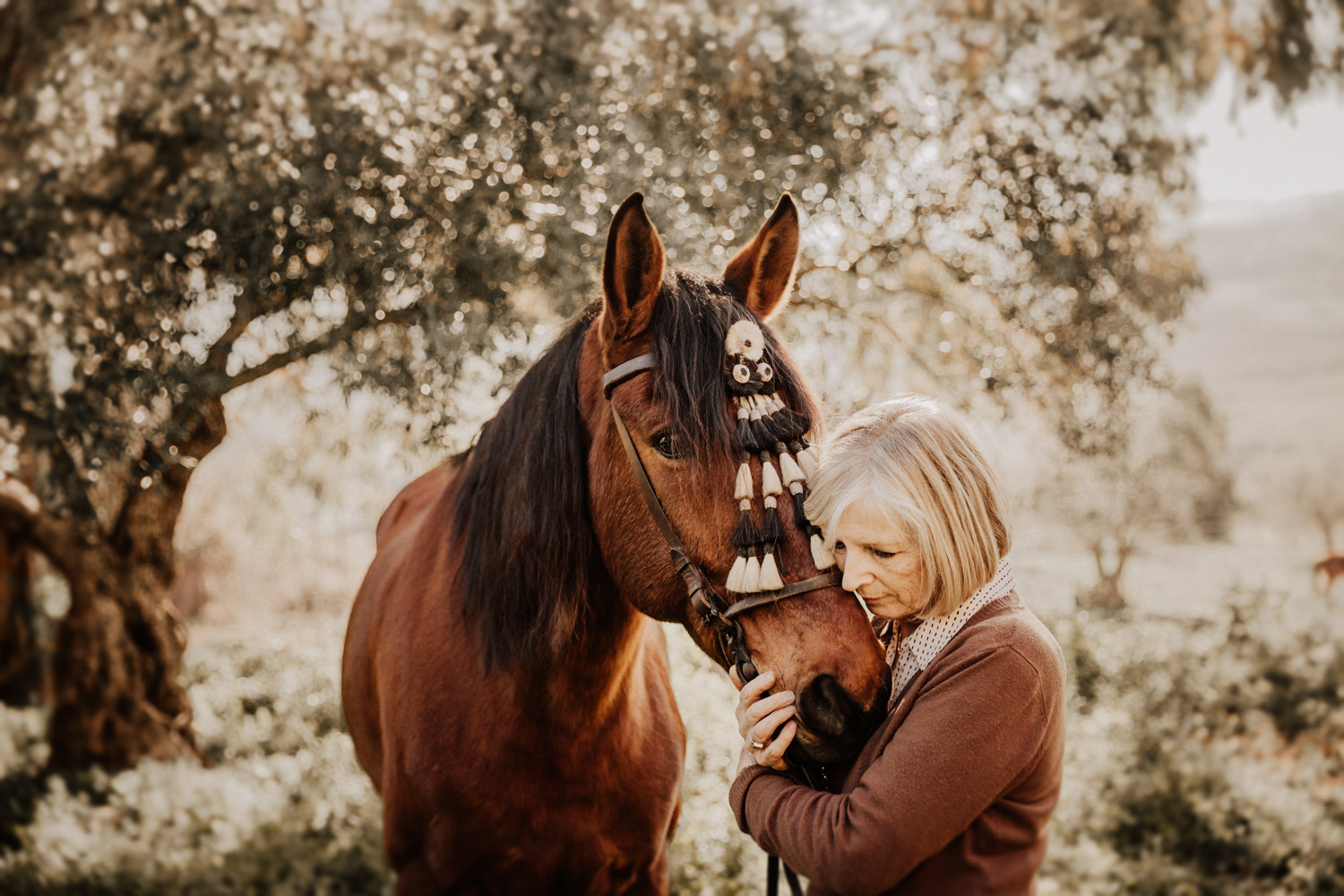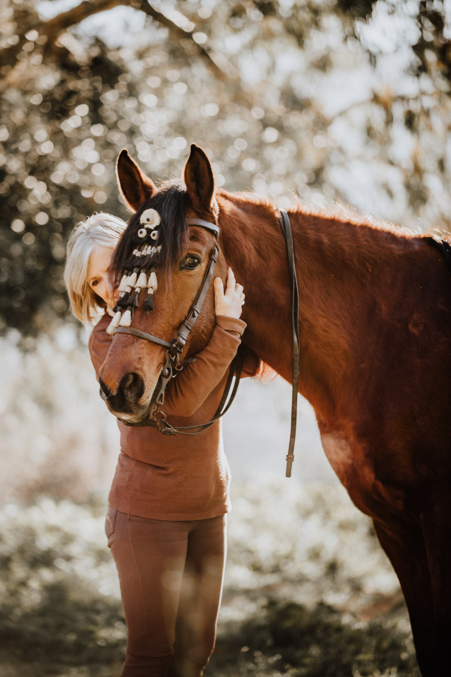 Kathy kommt ursprünglich aus England und hat in ihrem Leben schon einige Pferde besessen. Mittlerweile wohnt sie mit ihrem Mann in Spanien, an ihrer Seite ist Cortez – ein spanischer Wallach. Diese zwei haben Helene’s und mein Herz ganz besonders erobert, denn selten sieht man auch als Aussenstehender so offensichtlich auf den ersten Blick, dass Pferd und Mensch so perfekt zusammenpassen. Kathy hat mir erzählt, dass sie Cortez schon fast verkauft hat weil sie sich gesundheitlich einfach nicht mehr in der Lage gefühlt hat, ein Pferd zu besitzen und sich darum zu kümmern, aber letztendlich hat sie es doch nicht übers Herz gebracht. Cortez passt mit einer Engelsgeduld auf sie auf, und sie ist ihm dafür von Herzen dankbar. “Weiss du”, hat sie mir erklärt, “er mag es nicht, wenn man ihm Dinge befiehlt. Ich bitte ihn immer höflich. Und manchmal mag er es, einfach nur gestreichelt zu werden.” Das haben die zwei während unserem Shooting ausführlich gezeigt und so war es, wie es immer sein sollte: Ruhig, entspannt, friedlich.