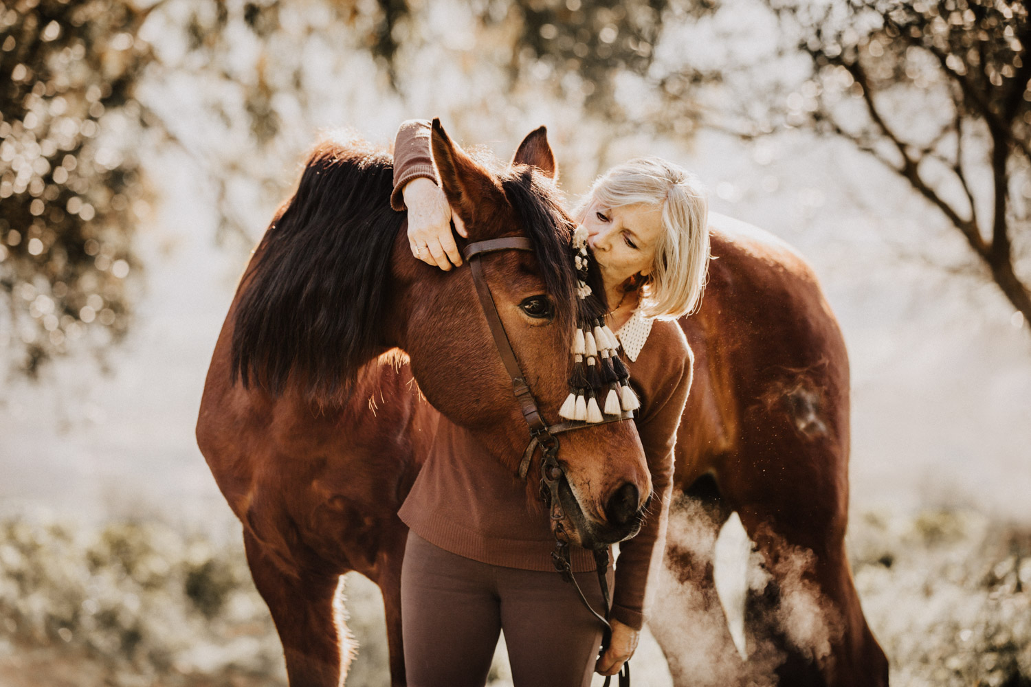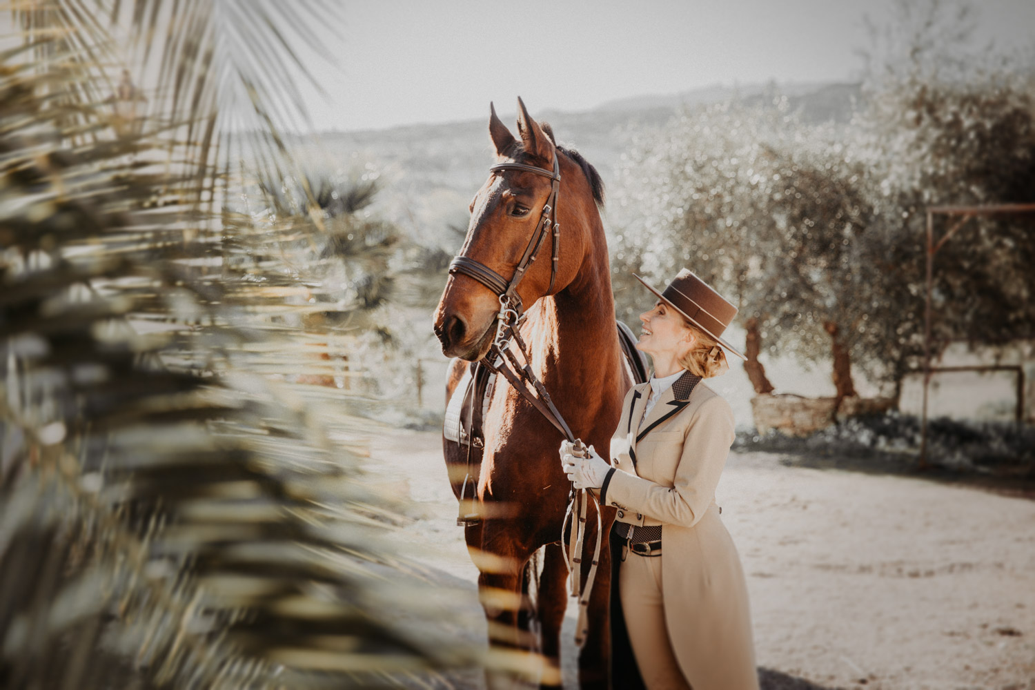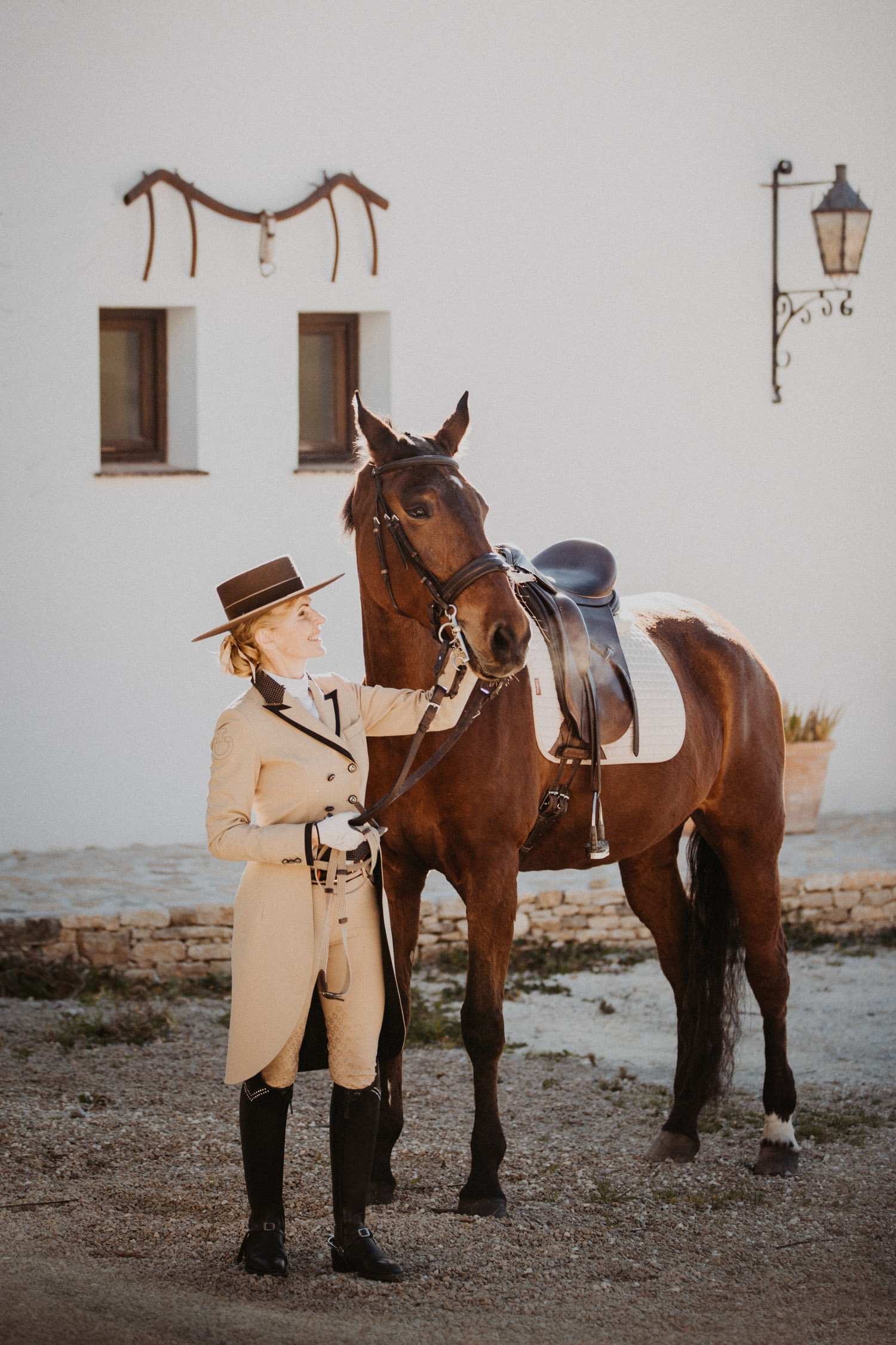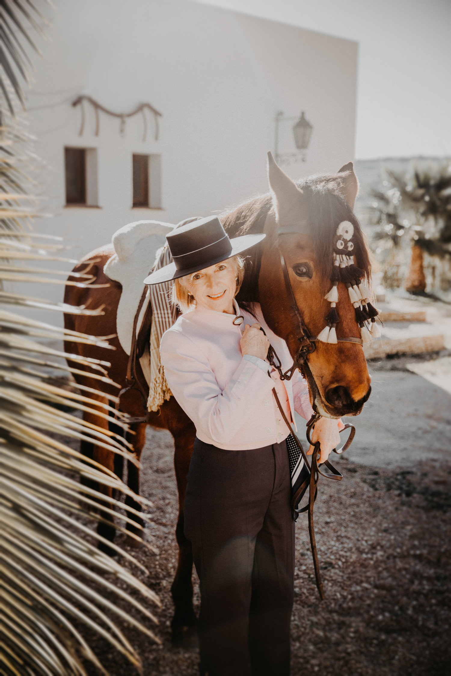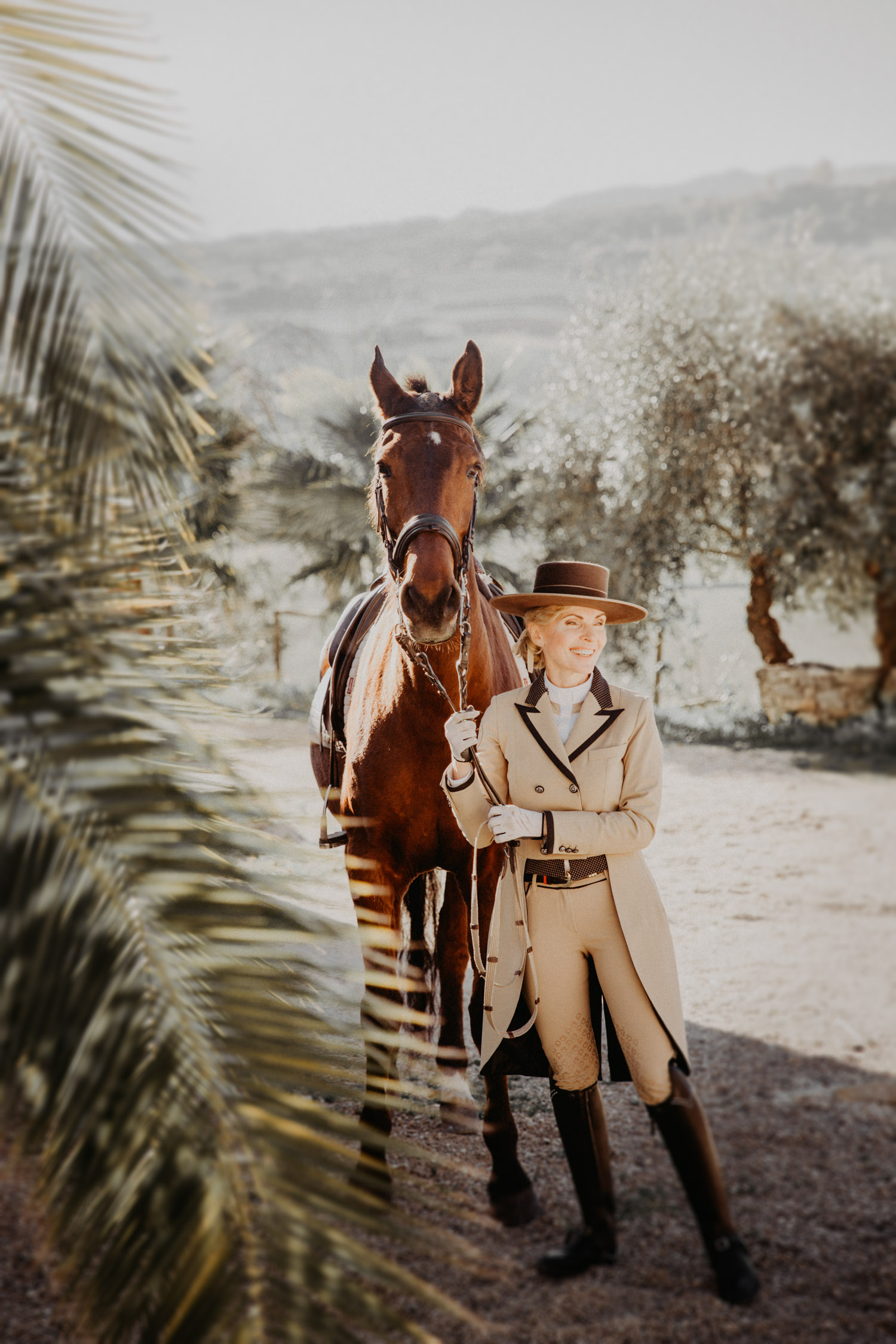 Kathy kommt ursprünglich aus England und hat in ihrem Leben schon einige Pferde besessen. Mittlerweile wohnt sie mit ihrem Mann in Spanien, an ihrer Seite ist Cortez – ein spanischer Wallach. Diese zwei haben Helene’s und mein Herz ganz besonders erobert, denn selten sieht man auch als Aussenstehender so offensichtlich auf den ersten Blick, dass Pferd und Mensch so perfekt zusammenpassen. Kathy hat mir erzählt, dass sie Cortez schon fast verkauft hat weil sie sich gesundheitlich einfach nicht mehr in der Lage gefühlt hat, ein Pferd zu besitzen und sich darum zu kümmern, aber letztendlich hat sie es doch nicht übers Herz gebracht. Cortez passt mit einer Engelsgeduld auf sie auf, und sie ist ihm dafür von Herzen dankbar. “Weiss du”, hat sie mir erklärt, “er mag es nicht, wenn man ihm Dinge befiehlt. Ich bitte ihn immer höflich. Und manchmal mag er es, einfach nur gestreichelt zu werden.” Das haben die zwei während unserem Shooting ausführlich gezeigt und so war es, wie es immer sein sollte: Ruhig, entspannt, friedlich.