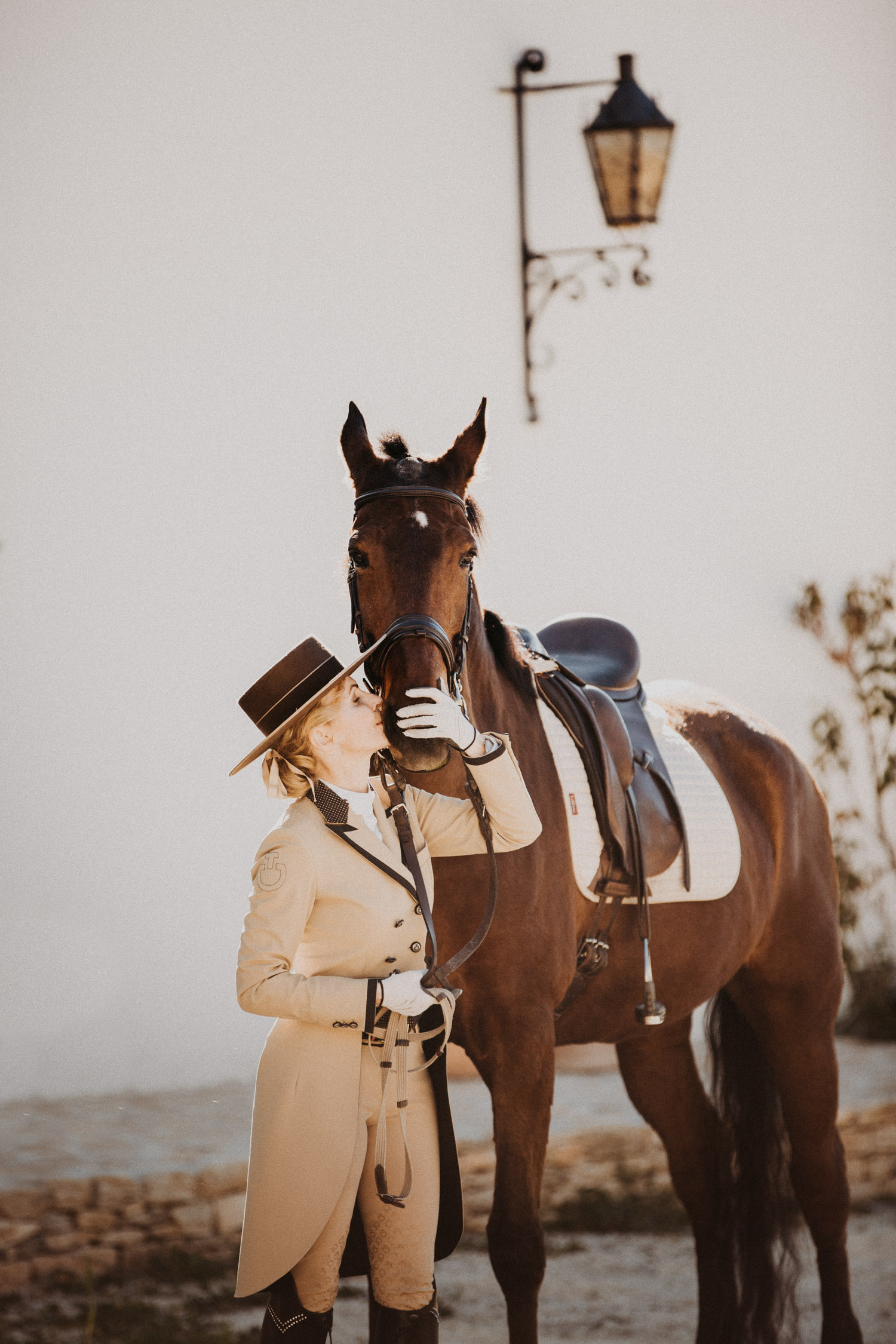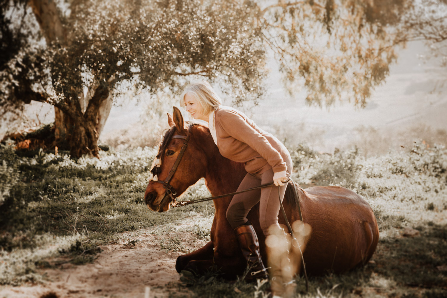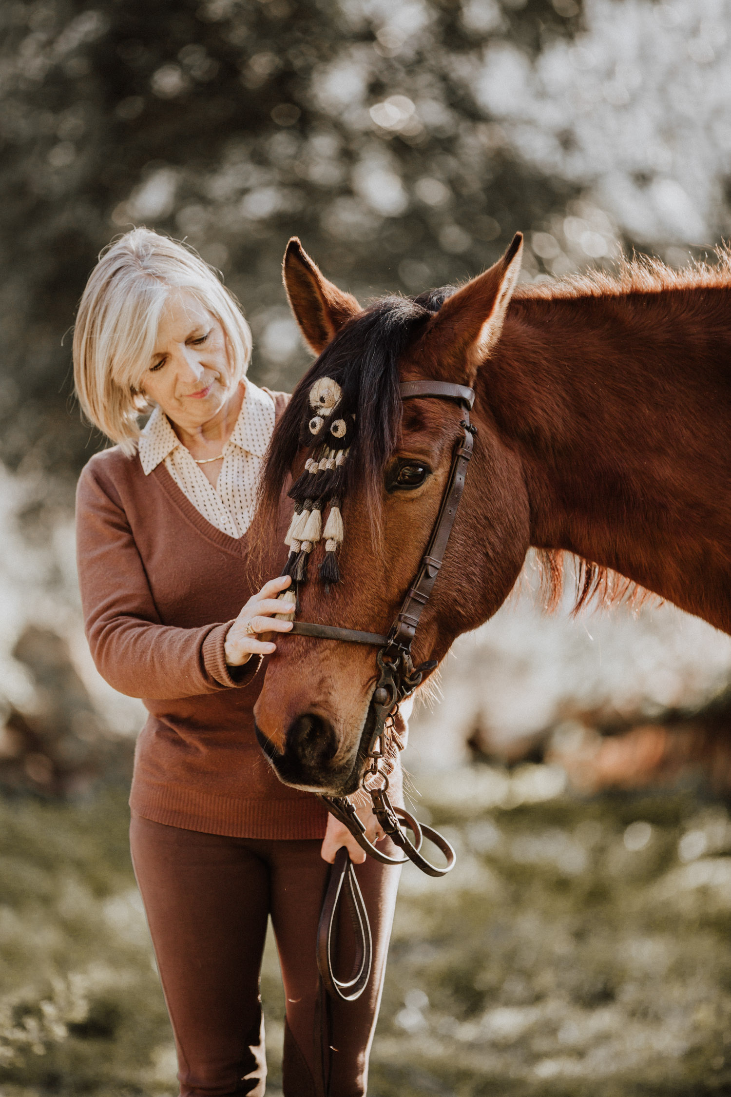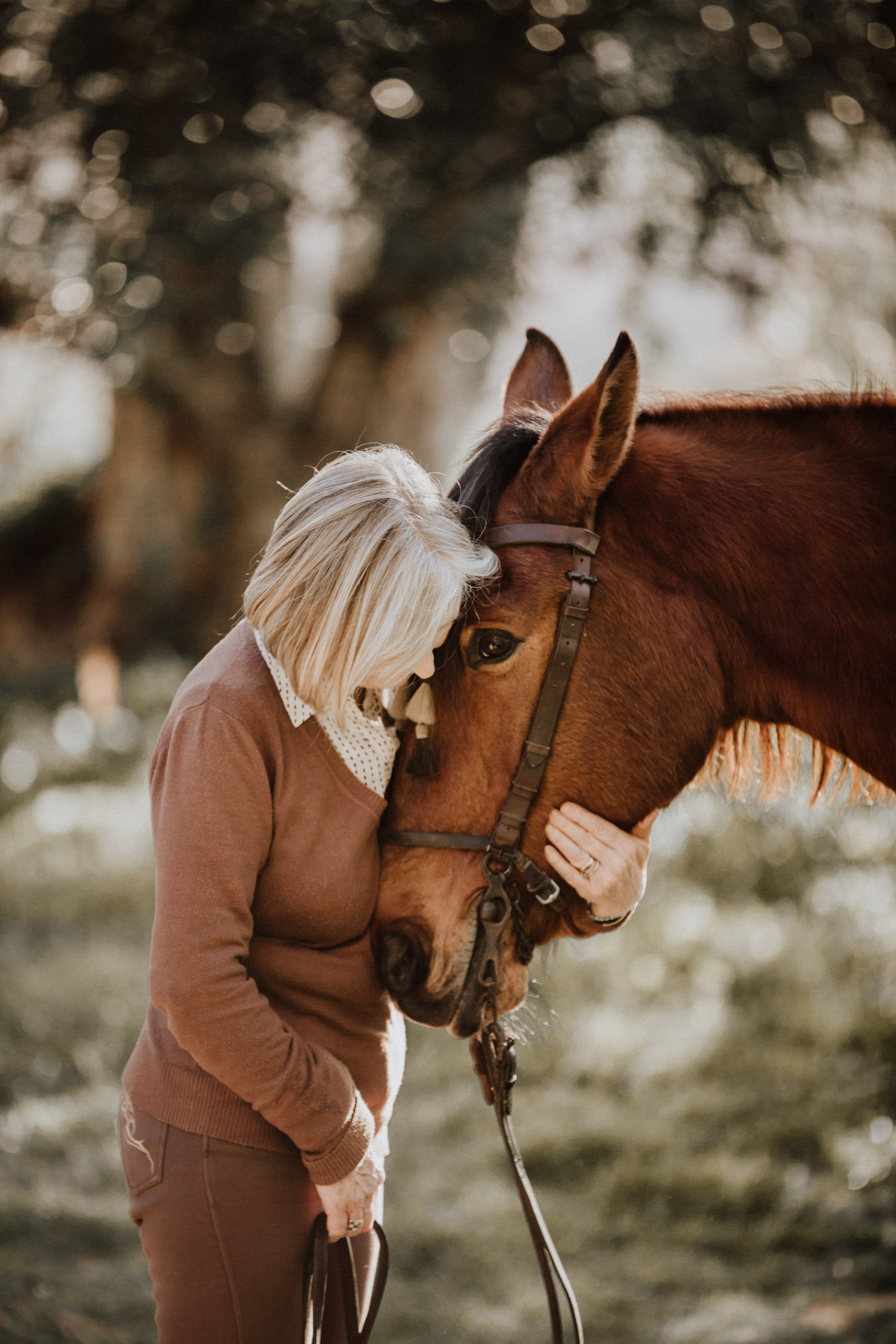 Kathy kommt ursprünglich aus England und hat in ihrem Leben schon einige Pferde besessen. Mittlerweile wohnt sie mit ihrem Mann in Spanien, an ihrer Seite ist Cortez – ein spanischer Wallach. Diese zwei haben Helene’s und mein Herz ganz besonders erobert, denn selten sieht man auch als Aussenstehender so offensichtlich auf den ersten Blick, dass Pferd und Mensch so perfekt zusammenpassen. Kathy hat mir erzählt, dass sie Cortez schon fast verkauft hat weil sie sich gesundheitlich einfach nicht mehr in der Lage gefühlt hat, ein Pferd zu besitzen und sich darum zu kümmern, aber letztendlich hat sie es doch nicht übers Herz gebracht. Cortez passt mit einer Engelsgeduld auf sie auf, und sie ist ihm dafür von Herzen dankbar. “Weiss du”, hat sie mir erklärt, “er mag es nicht, wenn man ihm Dinge befiehlt. Ich bitte ihn immer höflich. Und manchmal mag er es, einfach nur gestreichelt zu werden.” Das haben die zwei während unserem Shooting ausführlich gezeigt und so war es, wie es immer sein sollte: Ruhig, entspannt, friedlich.