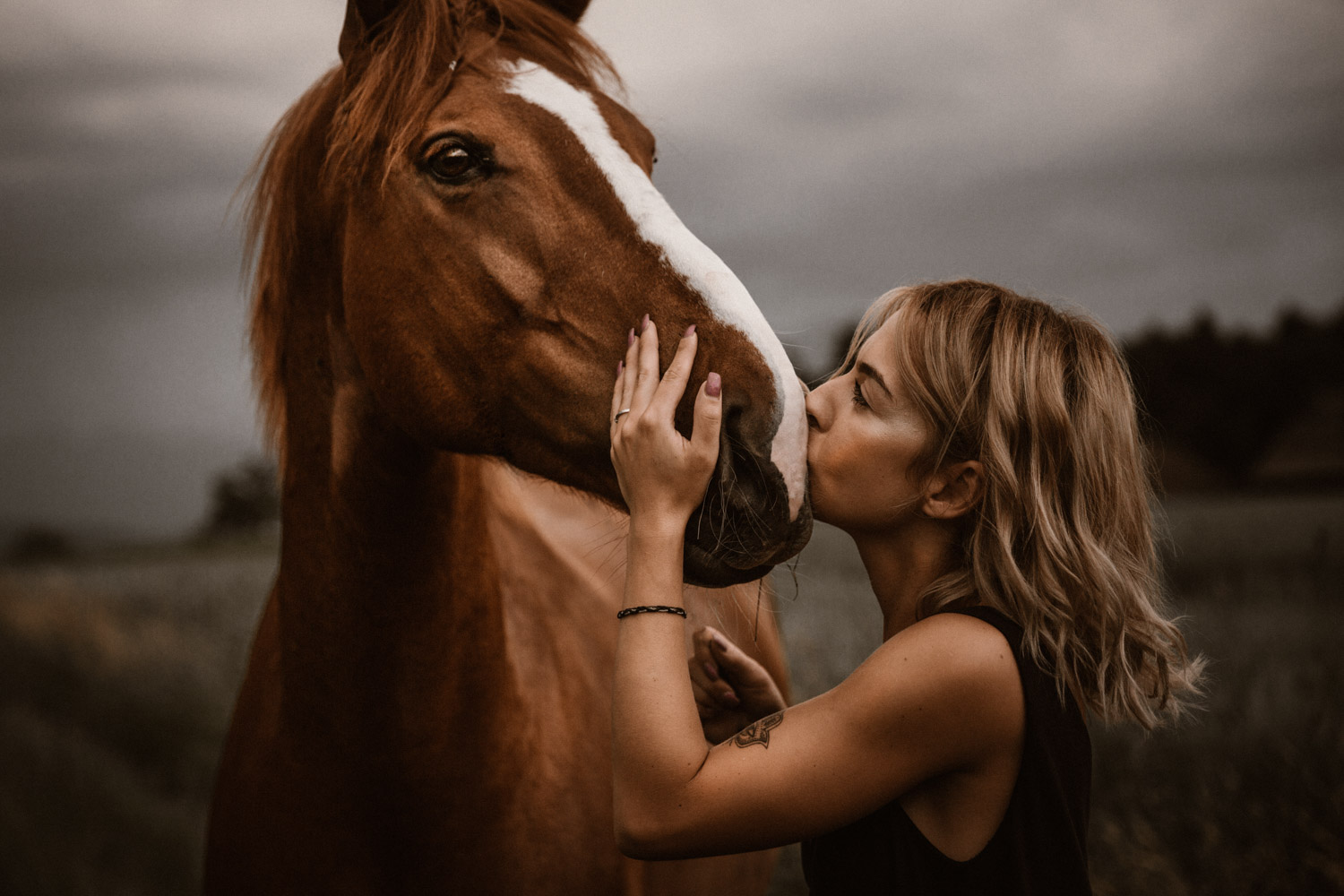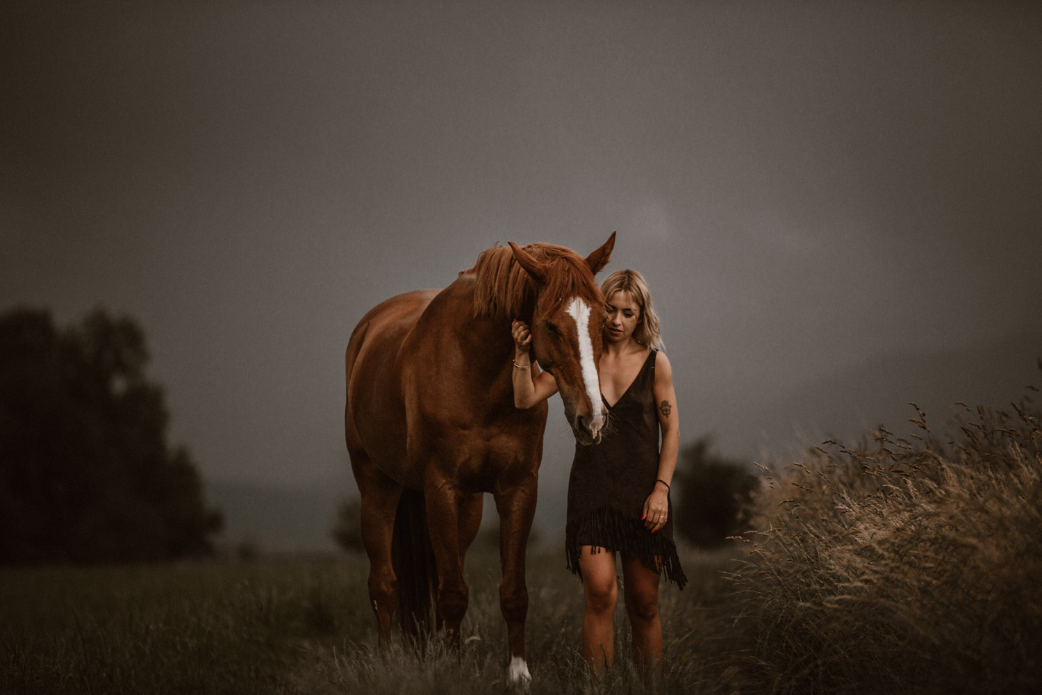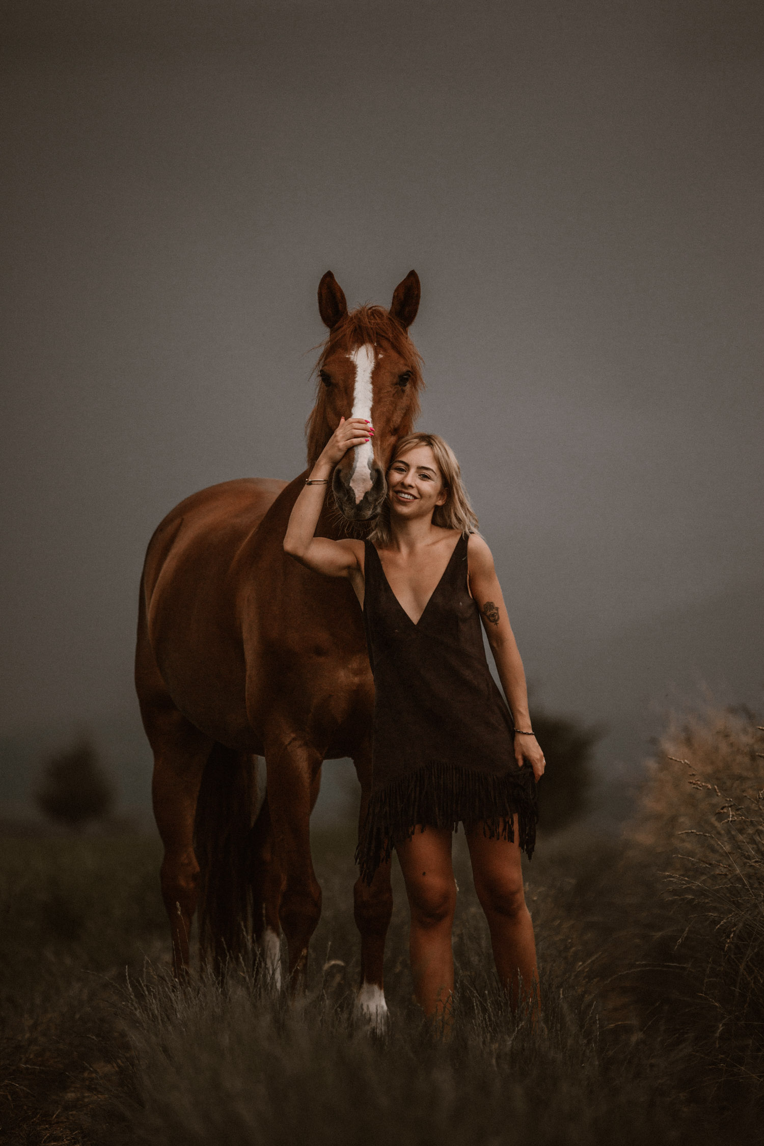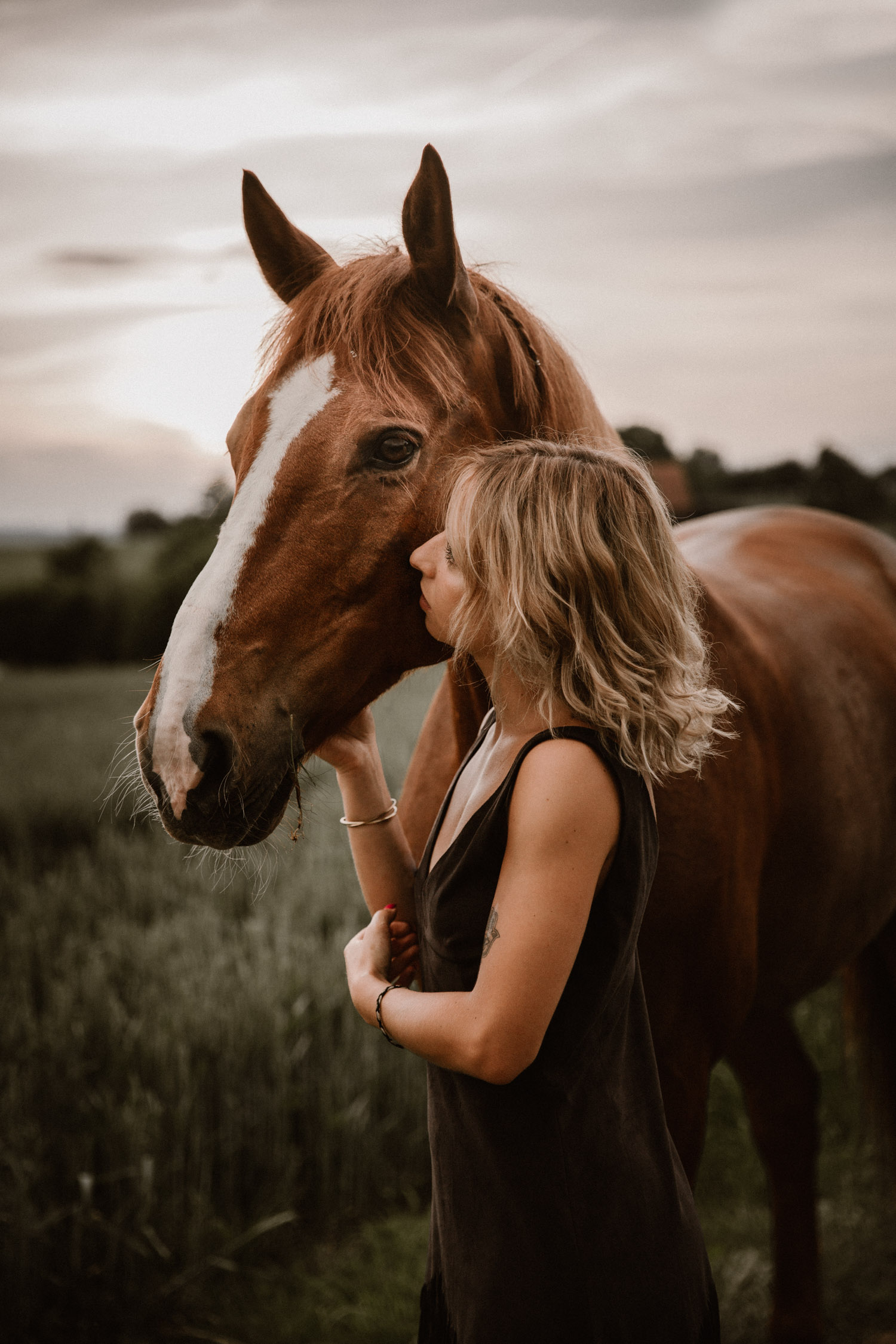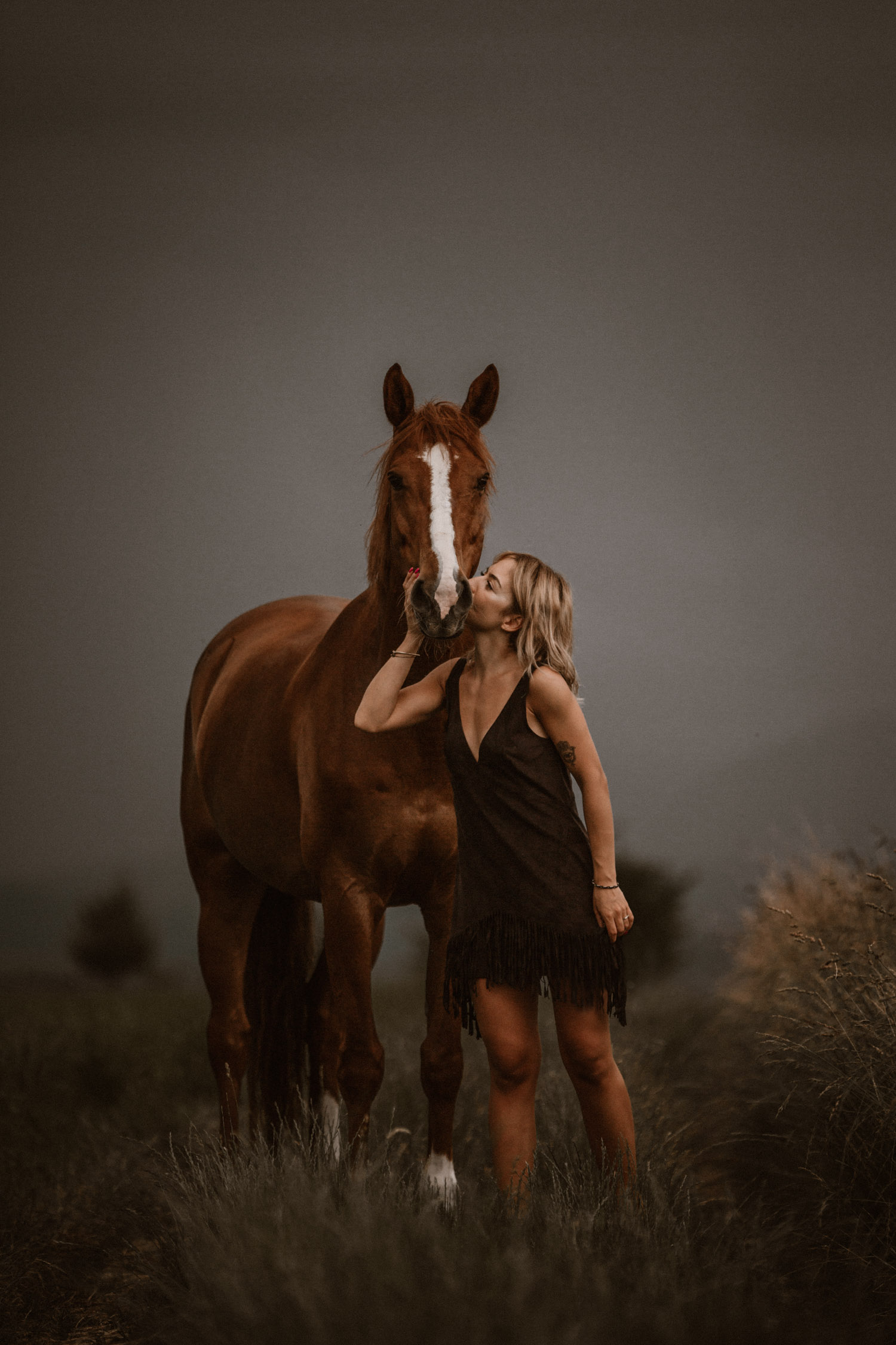 Mégane ist ursprünglich aus der Westschweiz, doch vor einiger Zeit ist sie ihrem mittlerweile Verlobten in die Deutschschweiz gefolgt. Kurz später ist Florris in ihr Leben getreten: Ein 7-jähriger Fuchswallach, geboren in den Niederlanden. Und weil jedes richtige Pferde-Mädchen auch einmal schöne Bilder von sich und seinem Pferd braucht, hat sie mich vor einiger Zeit angefragt für ein Pferdeshooting in Luzern. Weil mein Französisch echt zu wünschen übrig lässt (kein Wort mehr gesprochen seit meiner Matur im Jahr 2012, leider) wurde das also mein erstes Shooting in Englisch – in der Schweiz zumindest. So sind wir losgezogen auf der Suche nach einer geeigneten Fotolocation und sind zum Glück auch bald fündig geworden. Leider war die Location noch bei anderen Wesen sehr beliebt: Insekten! Unglaublich viele waren es, aber Florris hat sich tapfer geschlagen. Dank meinem neuen, einfach retuschierbaren Shootinghalfter konnten wir ihn ohne Trense fotografieren. Irgendwann hatte der hübsche Fuchswallach aber definitiv genug von all diesen Viechern und wir haben uns auf die Suche nach einer anderen Location gemacht. Langsam ging die Sonne unter, und zu meiner Begeisterung zogen Gewitterwolken auf. Ich liebe es! Ein richtig schöner Gewitterhimmel ist so stimmungs- und ausdrucksvoll. Leider lässt sich aber ein “Gewittershooting” eher schlecht planen – wenn mans planen wollte hätte man wahrscheinlich Pech und es würde einfach nur regnen. Darum lasse ich das und freue mich über die Gelgenheiten, bei denen ich durch Zufall das Glück habe. Vor wenigen Jahren hatte ich dieses Glück schon einmal, damals folgte kurz darauf ein Gewitter wie ich es sonst noch nie erlebt habe. Diesmal blieben wir zum Glück trocken und konnten den Himmel ausgiebig geniessen und nutzen. Das dunkle Blau und das Orange von Florris’ Fell ergänzen sich einfach perfekt und ergeben eine wunderbare Stimmung. Es muss einfach wirklich nicht immer ein romantischer Sonnenuntergang sein – im Gegenteil. Danke Mégane & Florris – für ein wunderbar ruhiges und friedliches Pferdeshooting in Luzern, das ich sehr gerne in Erinnerung halten werde.