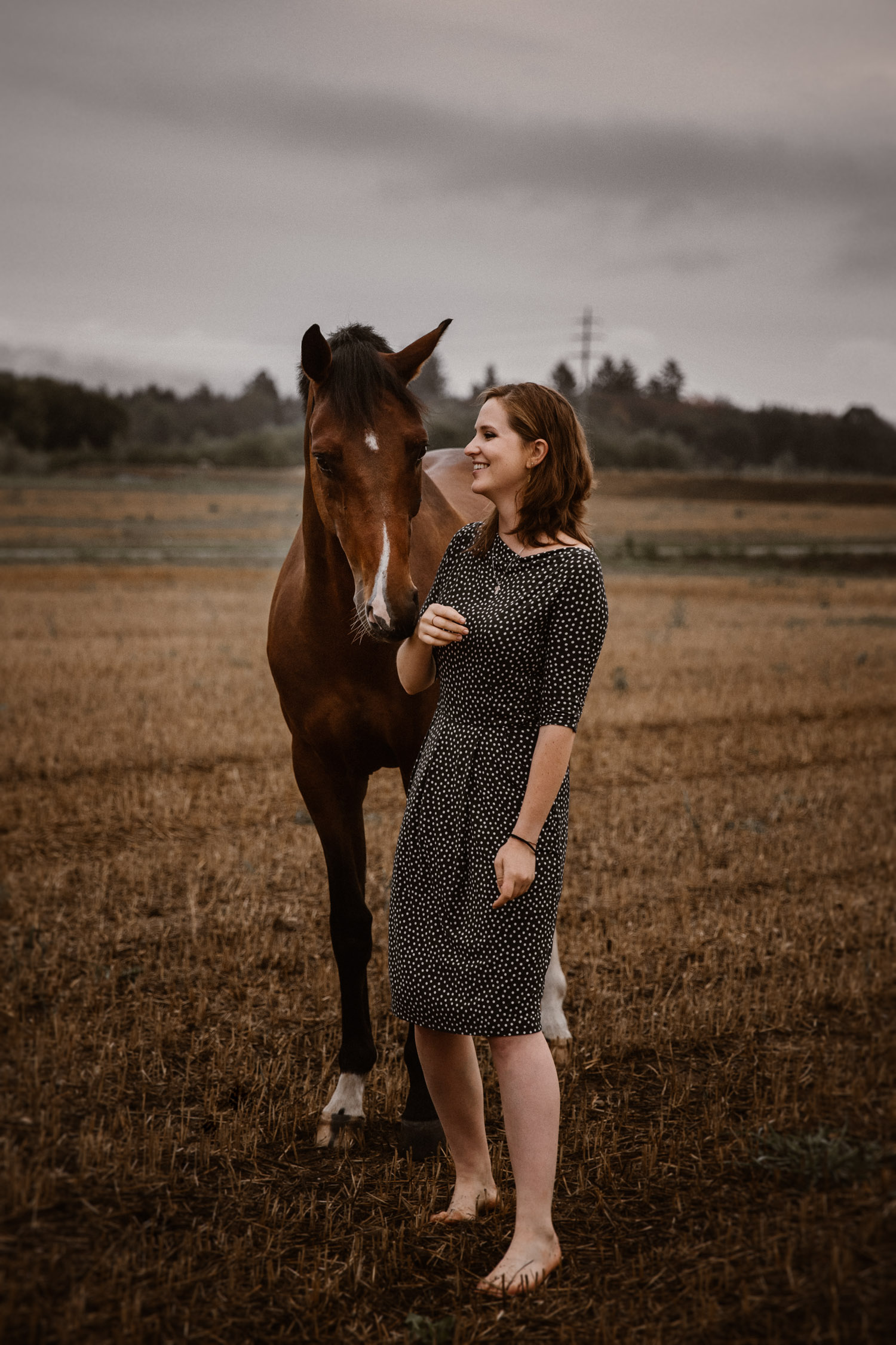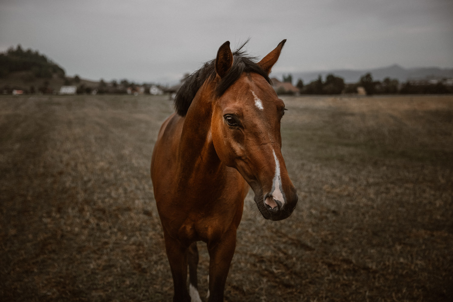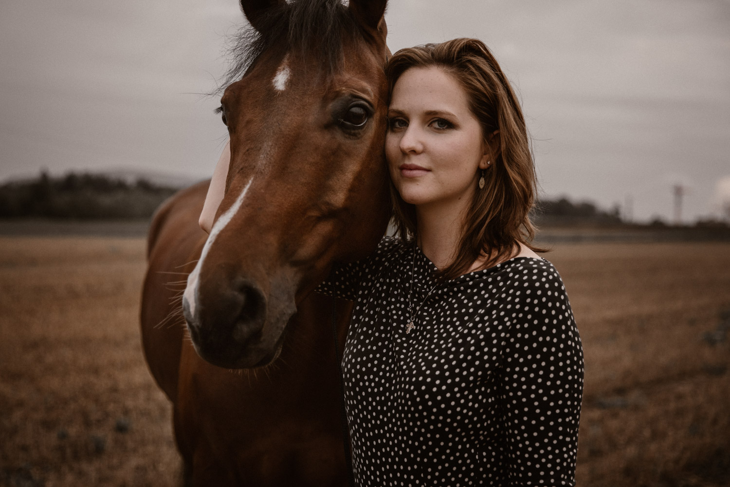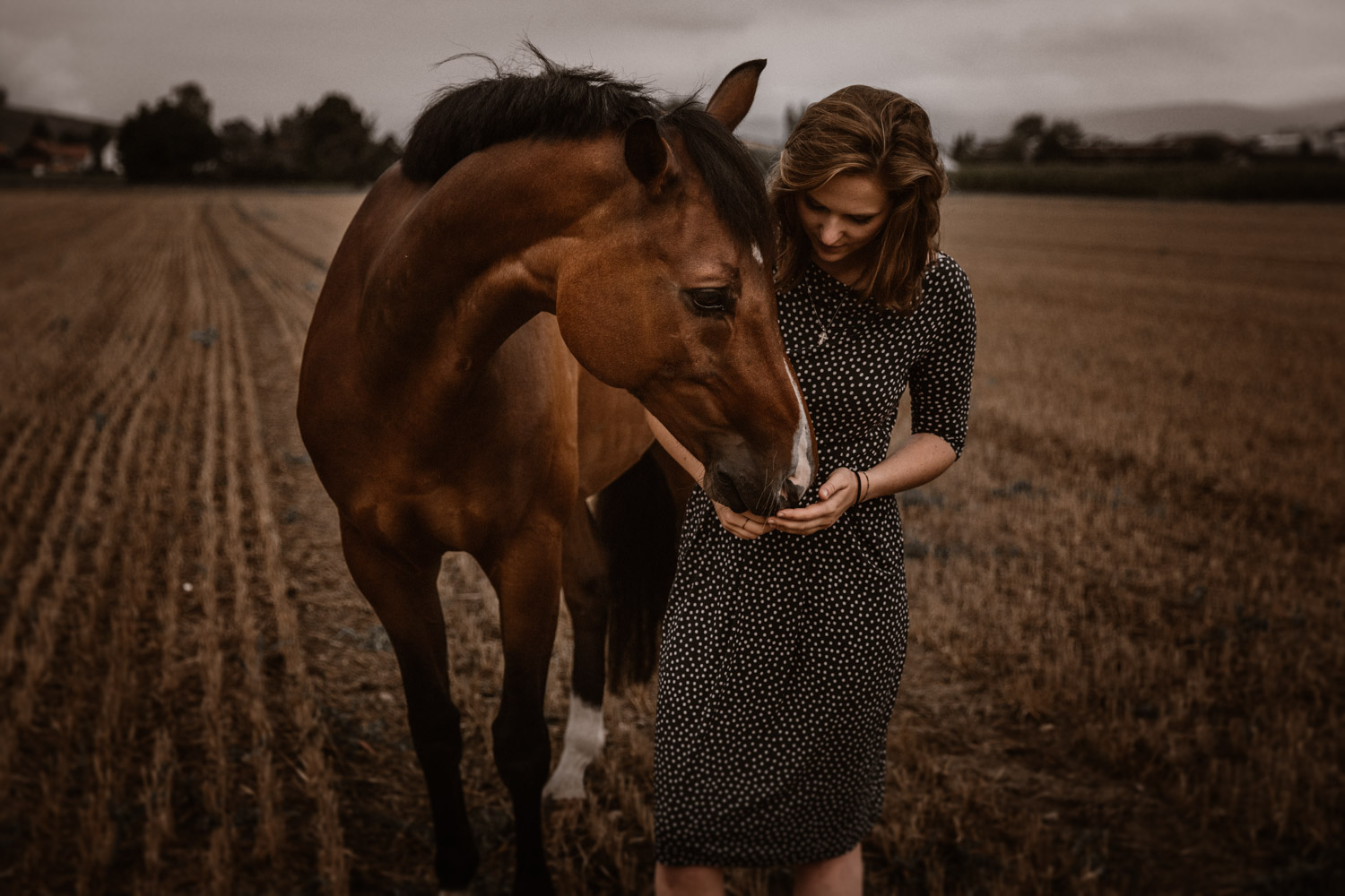 Wer ein bisschen auf Instagram unterwegs ist und das Rössli-Gen in sich trägt, kommt an Olga und Cornet fast nicht vorbei. Unter dem Namen “kurzkehrt” betreibt Olga dort seit einiger Zeit einen Blog und erzählt aus ihrem Leben als Pferdebesitzerin. Dem einen oder anderen mag sich an der Stelle ein Gähnen aufdrängen – kann ich verstehen, denn solche Pferdeseiten gibt es mittlerweile mehr als genug. Doch während die meisten dieser Blogs unter der Durchschnittlichkeit ihrer Betreiber(innen) leiden oder zur Dauerwerbesendung verkommen, schafft es Olga, dass mein Herz jedesmal ein bisschen hüpft, wenn mein Newsfeed mir etwas Neues von kurzkehrt präsentiert. Mit erfrischender Nüchternheit und einem Mix aus Ernsthaftigkeit und sehr viel selbstironischem Humor analysiert Olga sich selbst, ihren Vierbeiner und die manchmal doch recht abstruse Rösseler-Welt. Als ich sie bei unserem Shooting gefragt habe, welche drei Eigenschaften Cornet am treffendsten beschreiben, kam als erstes: “Er ist mein bester Kumpel.” Genau das strahlen die beiden, auf eine völlig unkitschige Art und Weise, auch aus – sowohl auf Instagram als auch im #reallife. Diese enge, aber nicht romantisierte Beziehung war neben der Tatsache, dass ich ein bisschen Mitschuld an Olgas Pferdebesitzer-Dasein trage, der Hauptgrund dafür, dass ich die beiden schon lange für ein Pferdeshooting besuchen wollte. Nach ein paar Mal verschieben und ein bisschen werweissen über das geeignete Wetter (wer Olga kennt, der weiss: Sie liebt Regen.), haben wir irgendwann relativ spontan beschlossen, das Shooting einfach durchzuziehen. Ziemlich unvorbereitet waren wir, sowohl im Bezug auf “Styling” als auch bzgl. Ort und Licht. Normalerweise bin ich sehr darauf bedacht, in dieser Hinsicht perfekte Bedingungen zu schaffen, sie erleichtern definitv die Erschaffung von atemberaubenden Bildern. Ein kitschiger Sonnenuntergang oder eine postkartentaugliche Landschaft sind gute Helfer wenn es darum geht, ein Bild zum “eye catcher” zu machen. Wenn ich davon nichts zur Verfügung habe, werde ich immer ein bisschen nervös, denn dann braucht es “echte” fotografische Skills, um ein Bild zu erschaffen, über das der Betrachter nicht einfach hinwegscrollt. Dieser Herausforderung stelle ich mich aber eigentlich gerne. So auch hier – wir sind losgezogen mit Olga & Cornet, einem lieben Helfer mit der richtigen Musik und meiner Kamera inkl. einem Objektiv, das “man” eigentlich als Pferdefotografin nicht benutzt (es wird langsam zu meinem Favoriten). Zwei Stunden, viel Spass und keine Posen später war ich um einige Bilder reicher, die ich sehr gerne mag. Danke Olga & Cornet für ein sehr entspannendes “back-to-the-root”-Shooting und danke Adi für deine sehr geduldige Hilfe!