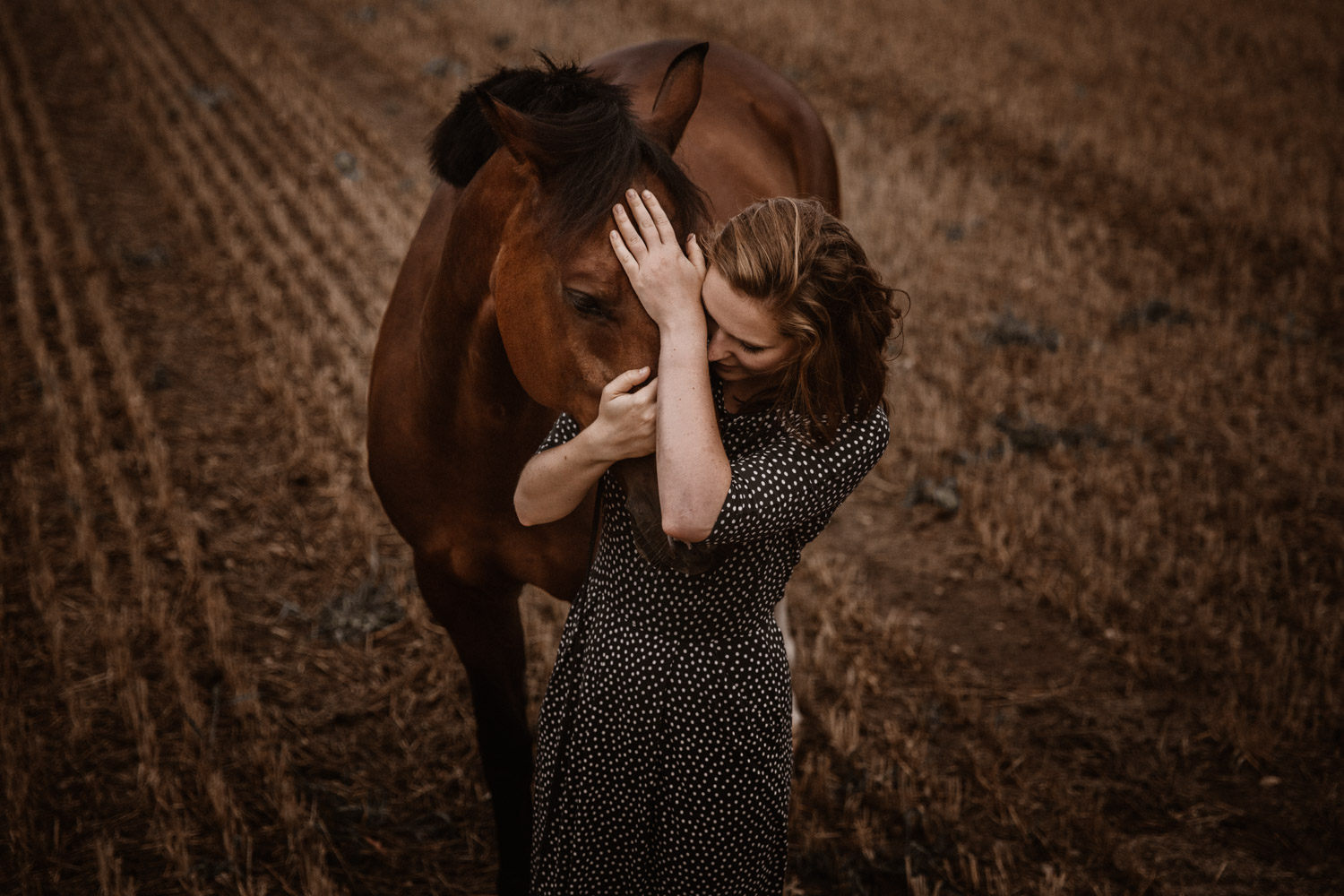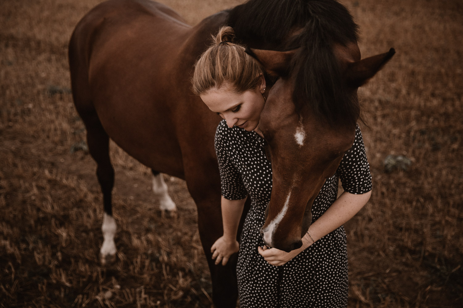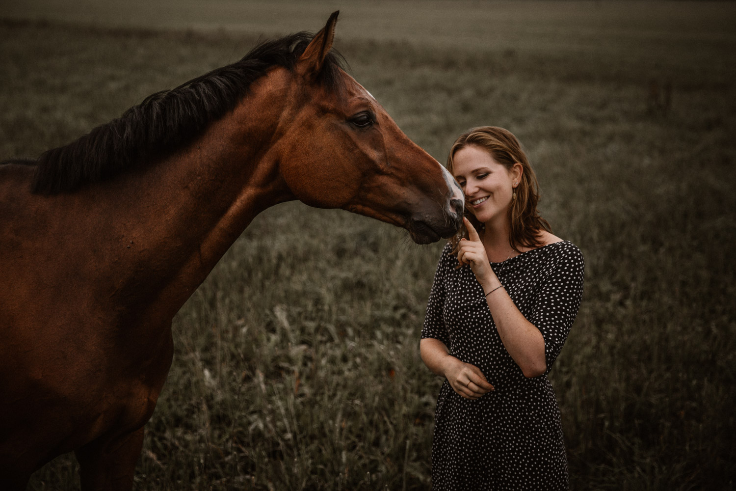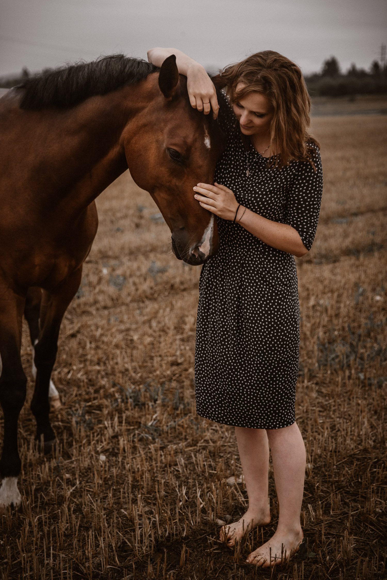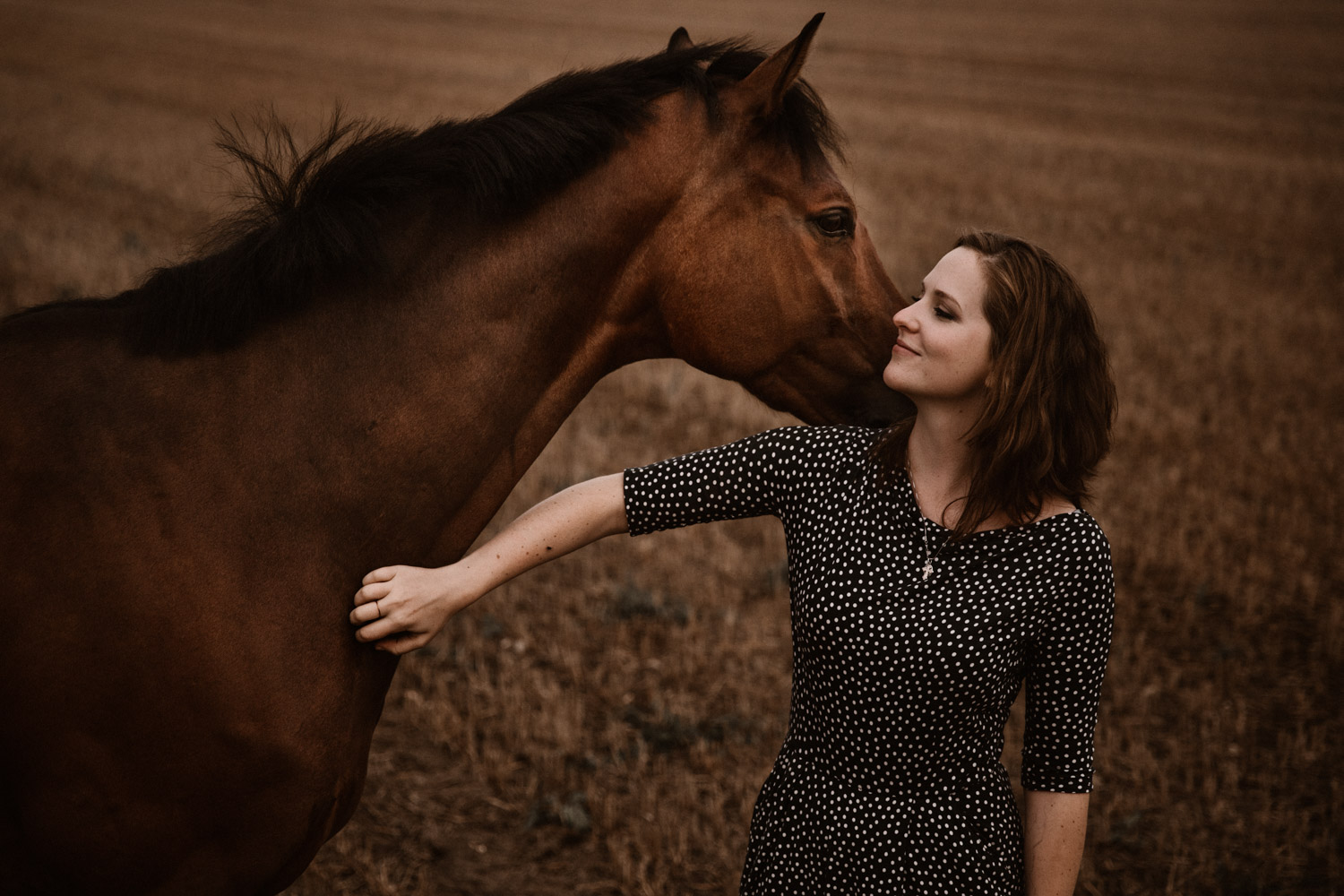 Wer ein bisschen auf Instagram unterwegs ist und das Rössli-Gen in sich trägt, kommt an Olga und Cornet fast nicht vorbei. Unter dem Namen “kurzkehrt” betreibt Olga dort seit einiger Zeit einen Blog und erzählt aus ihrem Leben als Pferdebesitzerin. Dem einen oder anderen mag sich an der Stelle ein Gähnen aufdrängen – kann ich verstehen, denn solche Pferdeseiten gibt es mittlerweile mehr als genug. Doch während die meisten dieser Blogs unter der Durchschnittlichkeit ihrer Betreiber(innen) leiden oder zur Dauerwerbesendung verkommen, schafft es Olga, dass mein Herz jedesmal ein bisschen hüpft, wenn mein Newsfeed mir etwas Neues von kurzkehrt präsentiert. Mit erfrischender Nüchternheit und einem Mix aus Ernsthaftigkeit und sehr viel selbstironischem Humor analysiert Olga sich selbst, ihren Vierbeiner und die manchmal doch recht abstruse Rösseler-Welt. Als ich sie bei unserem Shooting gefragt habe, welche drei Eigenschaften Cornet am treffendsten beschreiben, kam als erstes: “Er ist mein bester Kumpel.” Genau das strahlen die beiden, auf eine völlig unkitschige Art und Weise, auch aus – sowohl auf Instagram als auch im #reallife. Diese enge, aber nicht romantisierte Beziehung war neben der Tatsache, dass ich ein bisschen Mitschuld an Olgas Pferdebesitzer-Dasein trage, der Hauptgrund dafür, dass ich die beiden schon lange für ein Pferdeshooting besuchen wollte. Nach ein paar Mal verschieben und ein bisschen werweissen über das geeignete Wetter (wer Olga kennt, der weiss: Sie liebt Regen.), haben wir irgendwann relativ spontan beschlossen, das Shooting einfach durchzuziehen. Ziemlich unvorbereitet waren wir, sowohl im Bezug auf “Styling” als auch bzgl. Ort und Licht. Normalerweise bin ich sehr darauf bedacht, in dieser Hinsicht perfekte Bedingungen zu schaffen, sie erleichtern definitv die Erschaffung von atemberaubenden Bildern. Ein kitschiger Sonnenuntergang oder eine postkartentaugliche Landschaft sind gute Helfer wenn es darum geht, ein Bild zum “eye catcher” zu machen. Wenn ich davon nichts zur Verfügung habe, werde ich immer ein bisschen nervös, denn dann braucht es “echte” fotografische Skills, um ein Bild zu erschaffen, über das der Betrachter nicht einfach hinwegscrollt. Dieser Herausforderung stelle ich mich aber eigentlich gerne. So auch hier – wir sind losgezogen mit Olga & Cornet, einem lieben Helfer mit der richtigen Musik und meiner Kamera inkl. einem Objektiv, das “man” eigentlich als Pferdefotografin nicht benutzt (es wird langsam zu meinem Favoriten). Zwei Stunden, viel Spass und keine Posen später war ich um einige Bilder reicher, die ich sehr gerne mag. Danke Olga & Cornet für ein sehr entspannendes “back-to-the-root”-Shooting und danke Adi für deine sehr geduldige Hilfe!